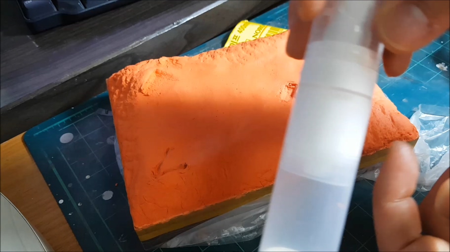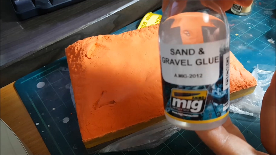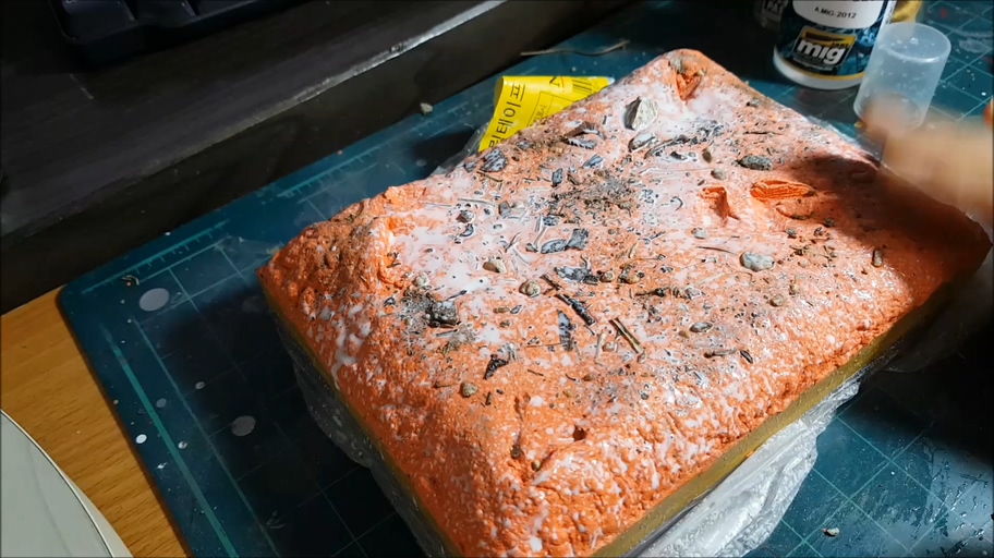 흙과 돌을 뿌려주면 스프레이로 물과 목공풀을 섞은 것을 뿌려줍니다.