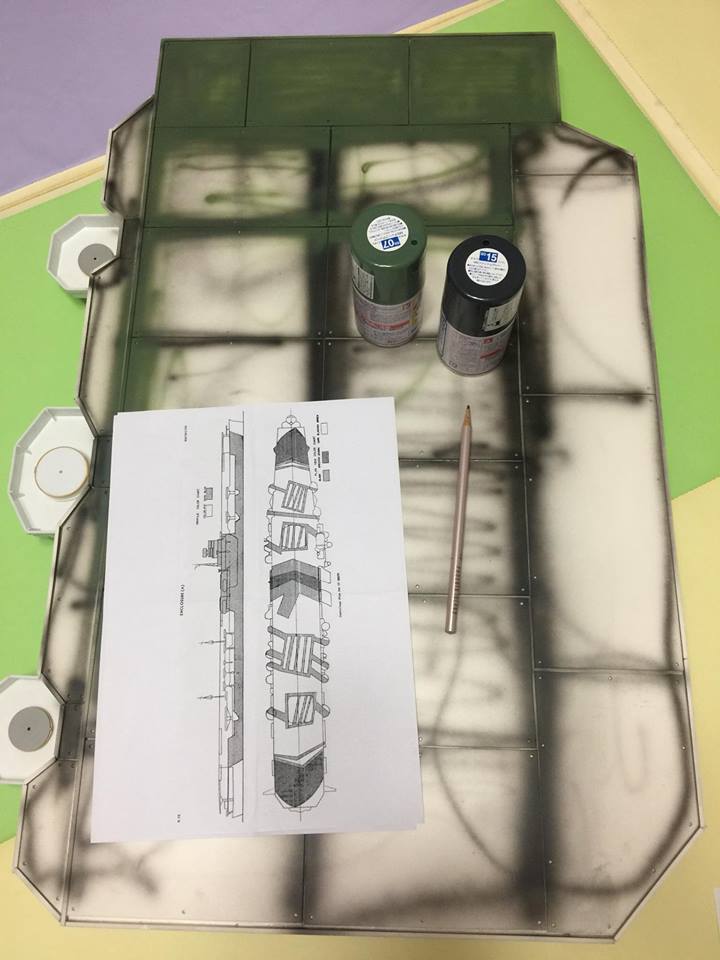 .........당초 계획은 선체는 외현 2호색 계열(딥그린 계열)로 가되 갑판은 다크그레이로 칠하는 다이호나 시나노 스타일로 칠할라 했지만 급거 계획변경