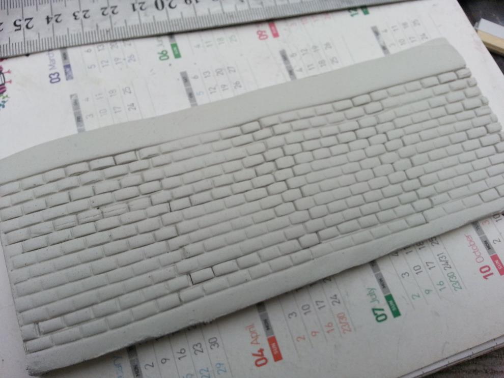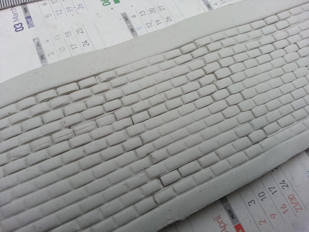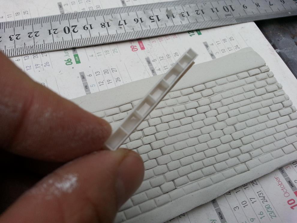 위 사진에서와 같이 플라판을 이용해서 벽돌 6개 정도를 한개 조로 만들어 지점토에 조심스레 찍어주면 비교적 질서정연한 벽돌벽이 완성됩니다.