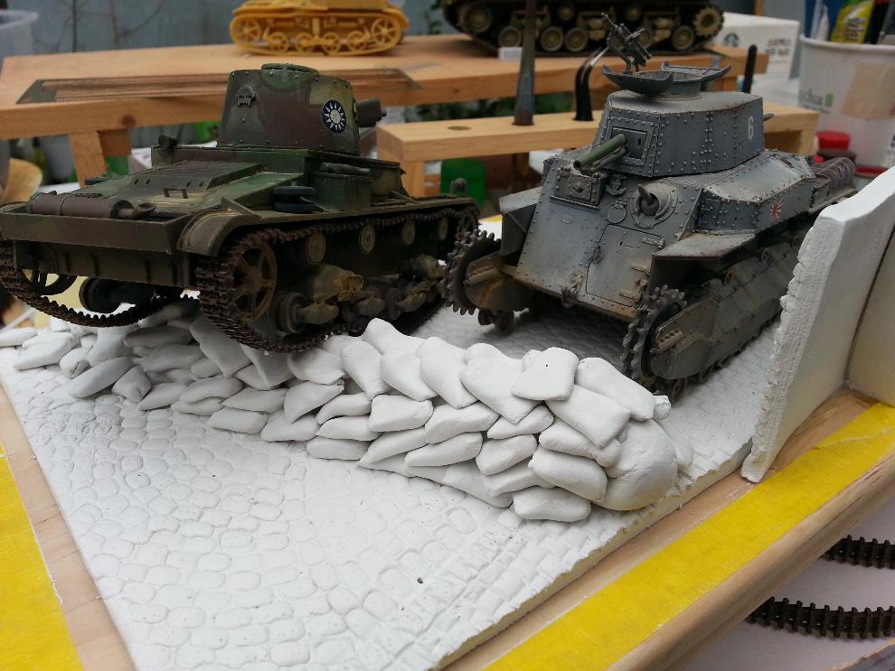 위 사진에서와 같이 일본군이 건물벽과 모래주머니에 의지해 만든 방어진지를 중국군 전차와 보병들이 돌파하는 장면을 연출해줄 계획입니다.