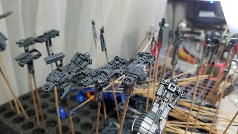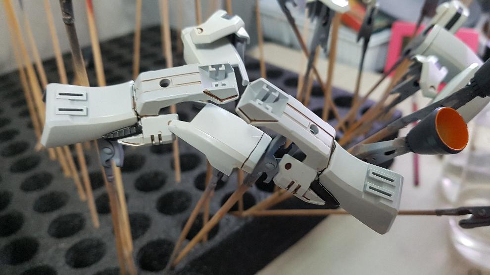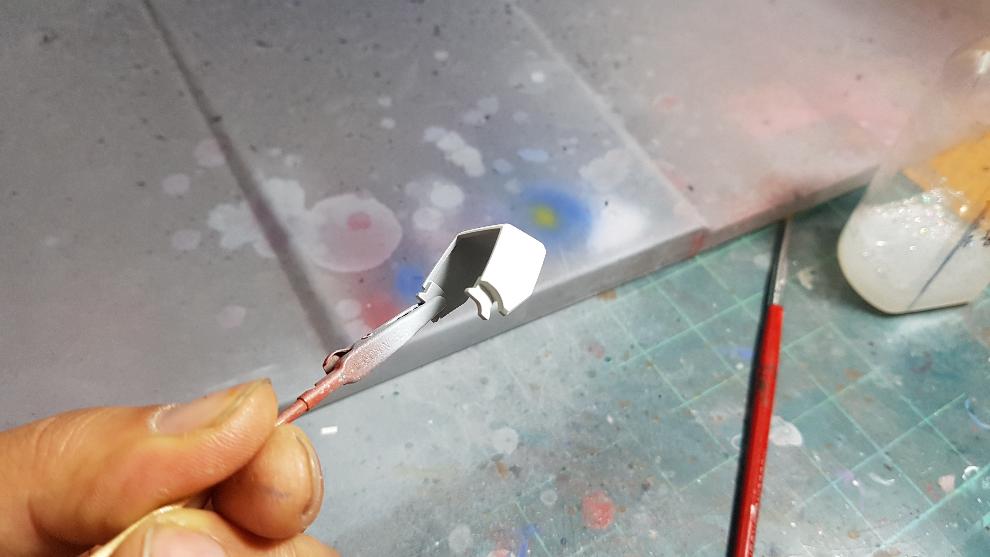 무장 색으로 들어가는 팬텀그레이의 경우 도색이 벗겨지면 안 되기 때문에 서페이서 위에 도색을 했습니다.