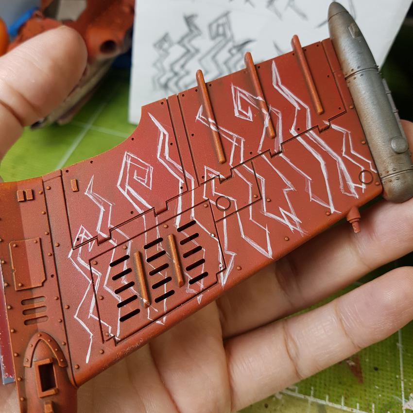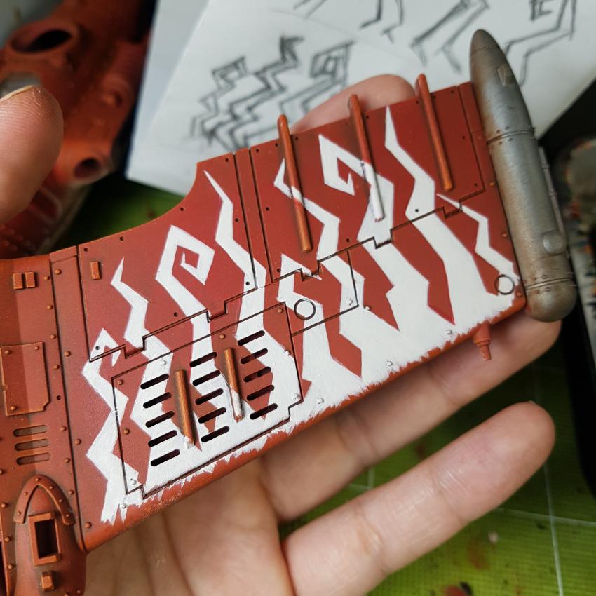 날개에는 아크릴로 프리핸드로 오크식 불꽃을 그려줍니다.