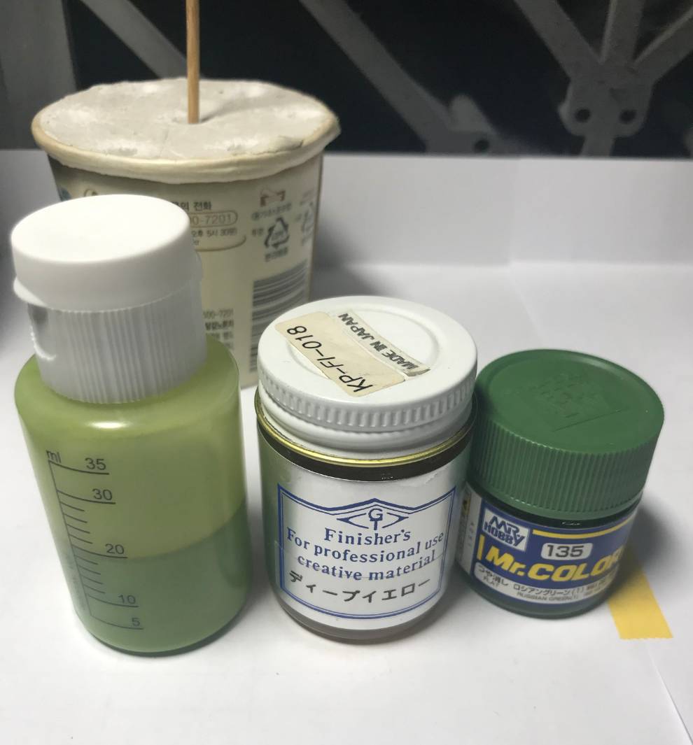 내부 기체색 조합입니다. 설명서는 노랭이 2: 그린 1 입니다. 집에 있는 적당한 도료 사용해서 조합, 피니셔스 노랑은 정확하진 않지만 적어도 7년전 산거 같습니다.