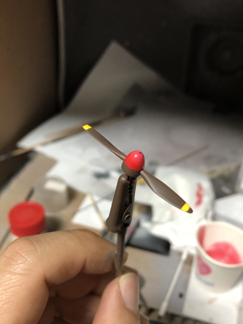 프로펠러는 앞부분이 빨간색인데, 유광으로 칠했고, 앞에서 뒤로 갈수록 색이 변하게 도색했습니다.