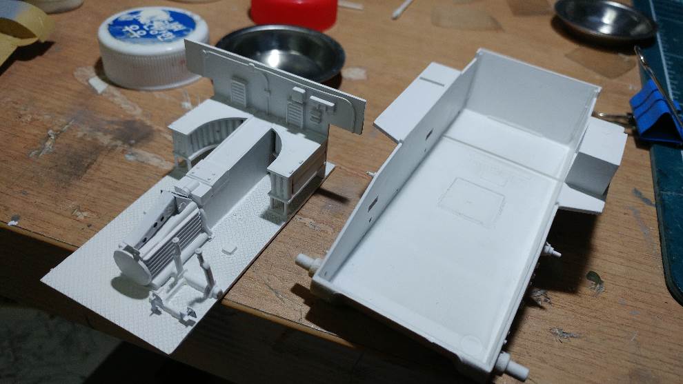 뒷쪽 차체 위의 상자 고리 및 힌지 그리고 궁댕이(?) 쪽에 OVM등의 공작이 남아서 도색에 들어가는 건