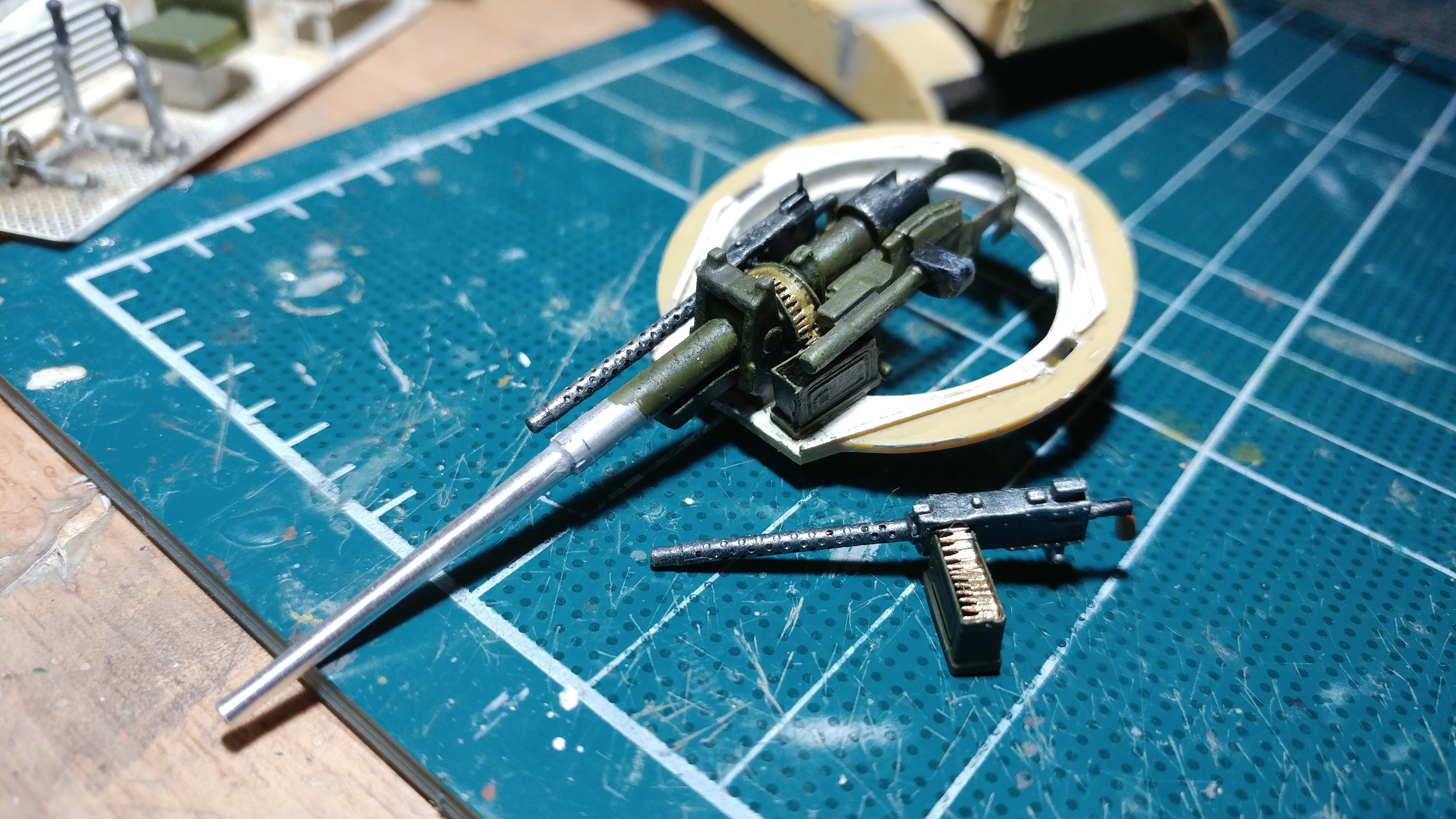 내부에 들어갈 포미랑 기관총이랑 꼼꼼하게 칠해 줍니다. 실차 사진을 찾아보니 전차포 관련 부품이