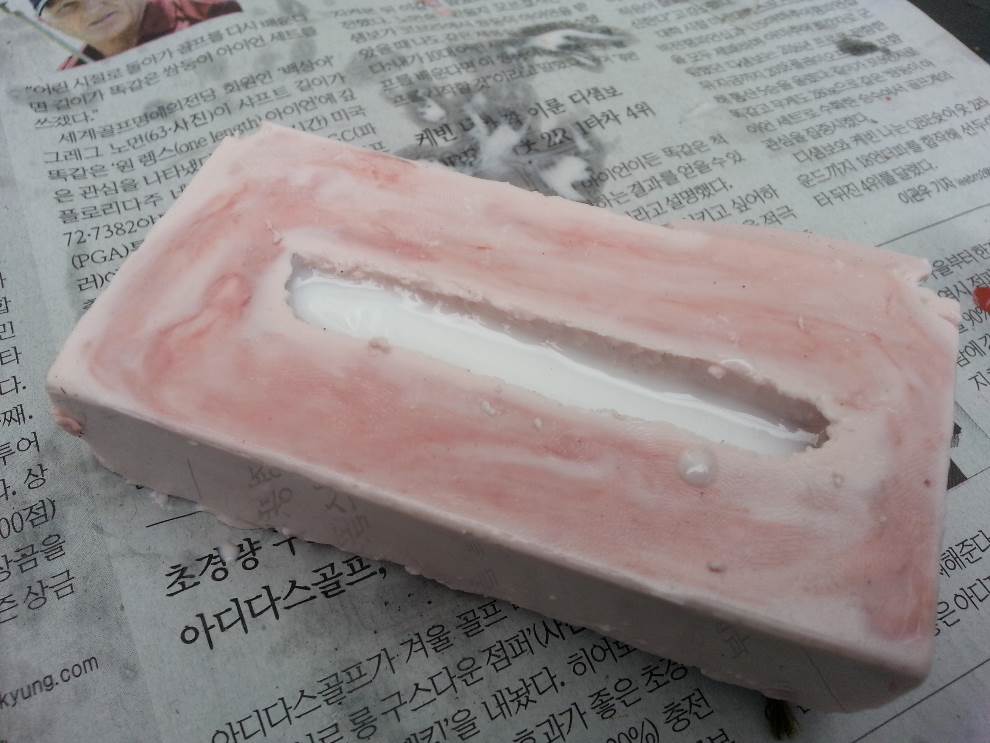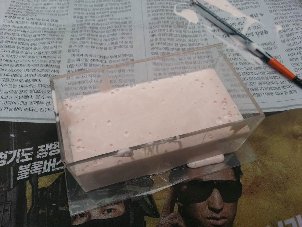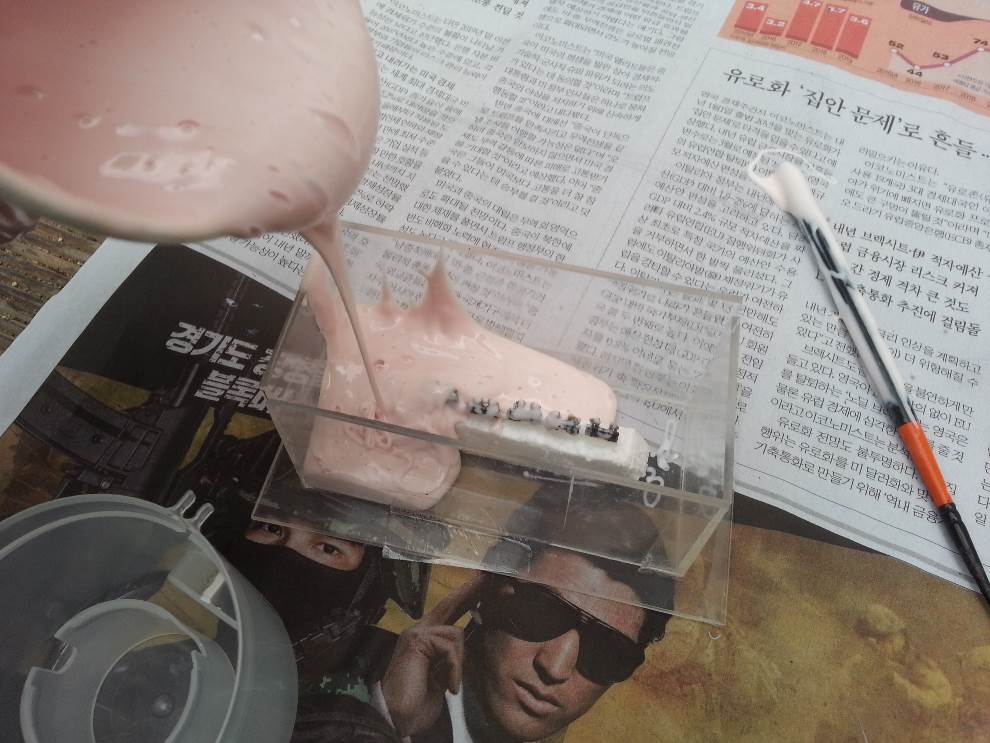 실리콘으로 틀을 만들어줍니다. 이제 실리콘이 굳어야 되는데 전에는 스포이트만 가지고도 비율을 뚝딱 뚝딱 잘맞췄던 것 같은데 1:1 비율이란 것이 질량비다 보니 잘 맞지 않아 몇번의 실패를 거듭해야 했습니다.