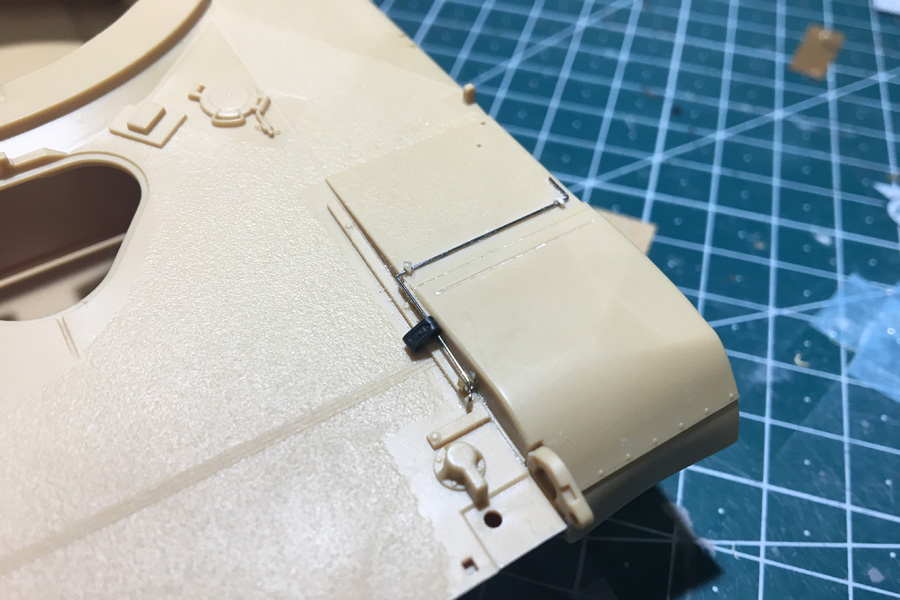 전방 펜더를 눌러주는 일종의 토션바같은 부분을 몰드와 에칭으로 재현해 놓았습니다만, 몰드와 에칭이 아무래도 이질감이 있을 것 같아서 그냥 몰드를 밀어내고 한방침으로 만들어 줍니다.