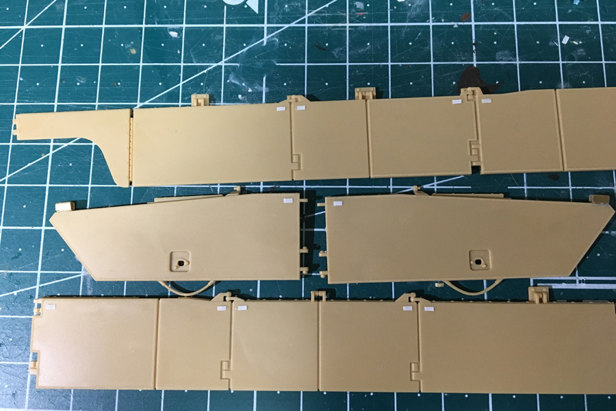 사이드스커트에 직사각형 디테일이 생략돼있어 얇은 플라판으로 덧붙여 줍니다. 그리고 1번 스커트 위쪽의 사각형 돌기는 안쪽이 꽉 막혀 있어, 드래곤 키트를 만들고 남은 에칭으로 바꿔줍니다.
