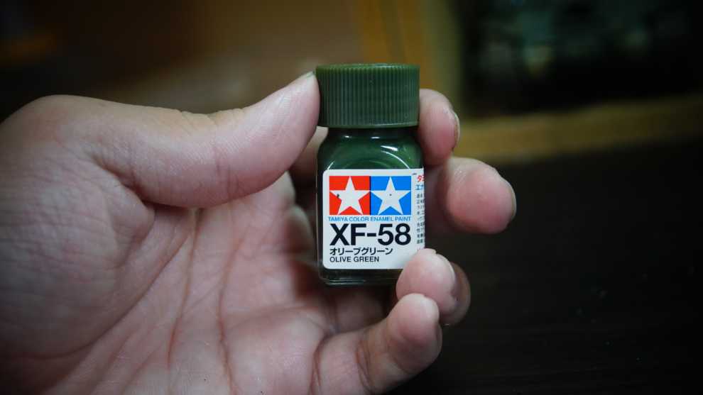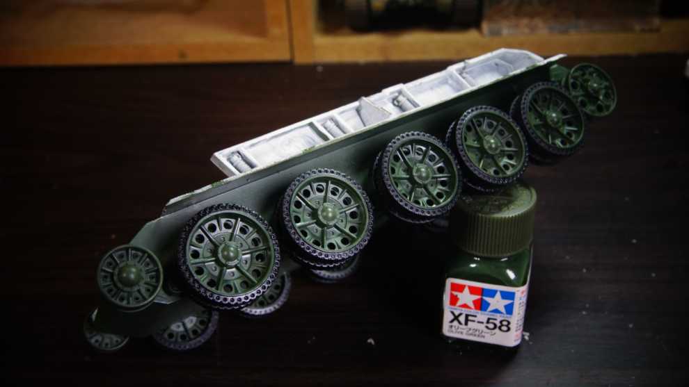 타미야 에나멜 XF - 58 Olive Green으로 칠했고 고무 타이어는 타미야 아크릴 XF - 1 Flat Black으로 칠했고,