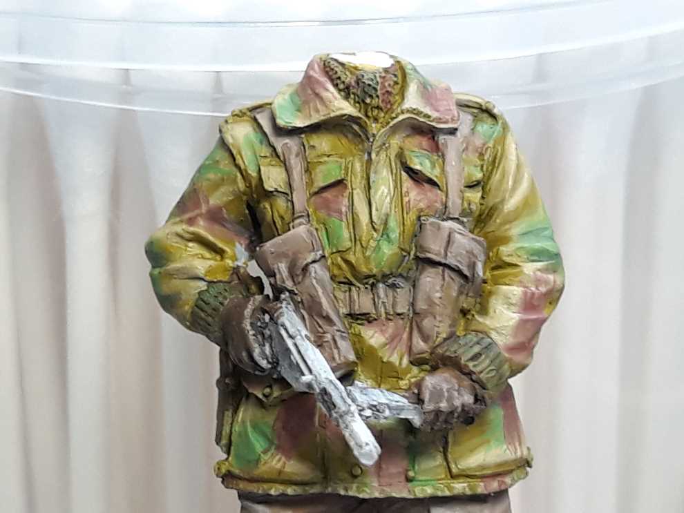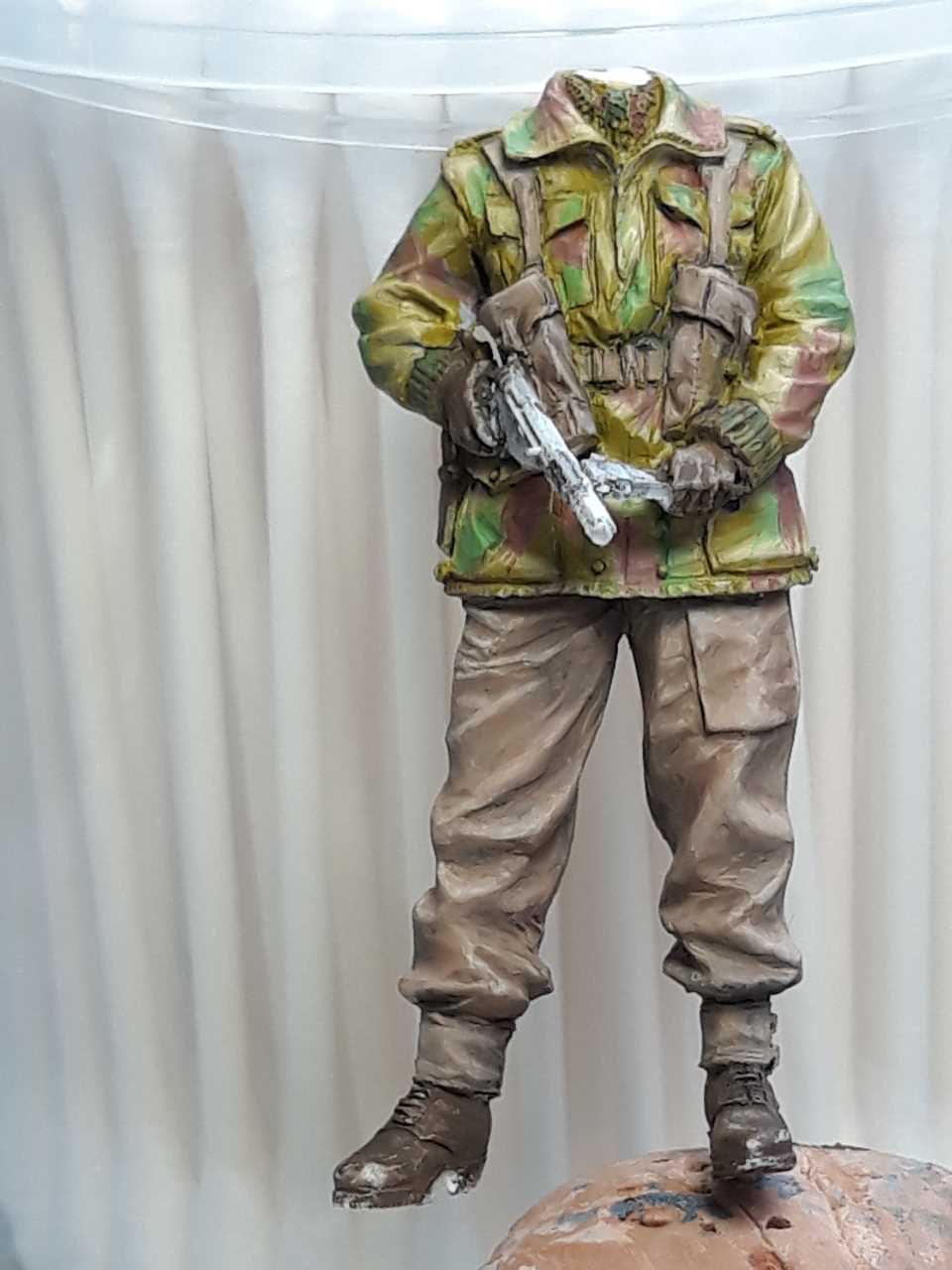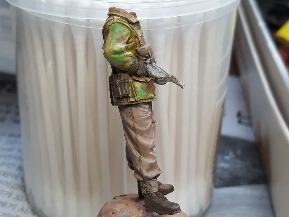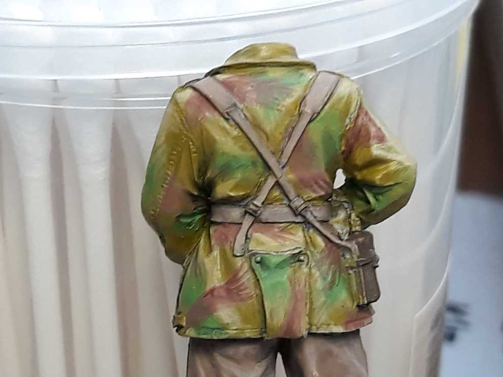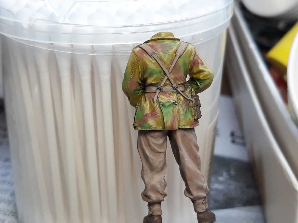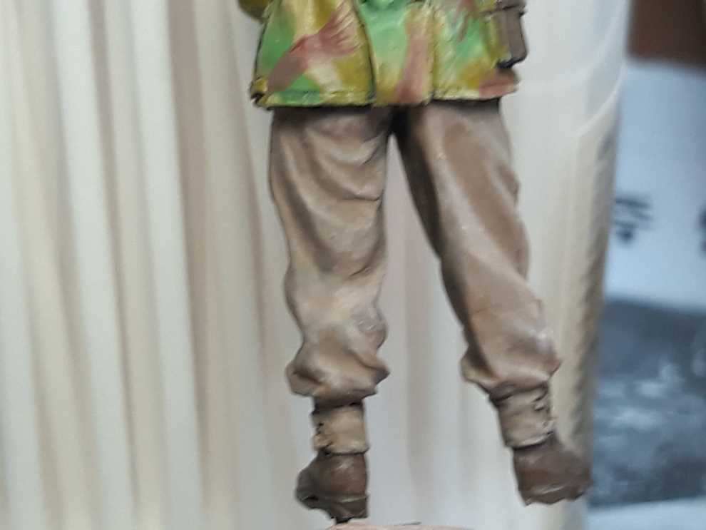 데니슨 스목 상의는 바에호 아크릴 다크 엘로우로 기본색 칠하고 조소냐 아크릴 스킨톤 베이스를 조금씩 추가해서 하이라이트 올려주었습니다. 위장색은 바에호 아크릴 유니폼그린에 역시 조소냐 아크릴스킨톤 베이스로 밝은 가능한한 밝은 색으로 녹색 기본을 잡고 주름진곳엔 스킨톤 베이스를 뺀 유니폼 그린만으로 어두운곳에 다크닝을 합니다