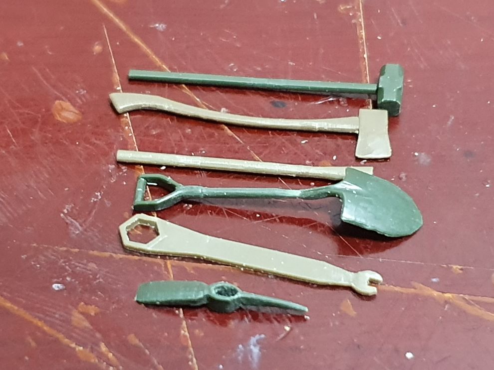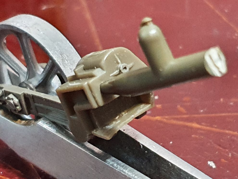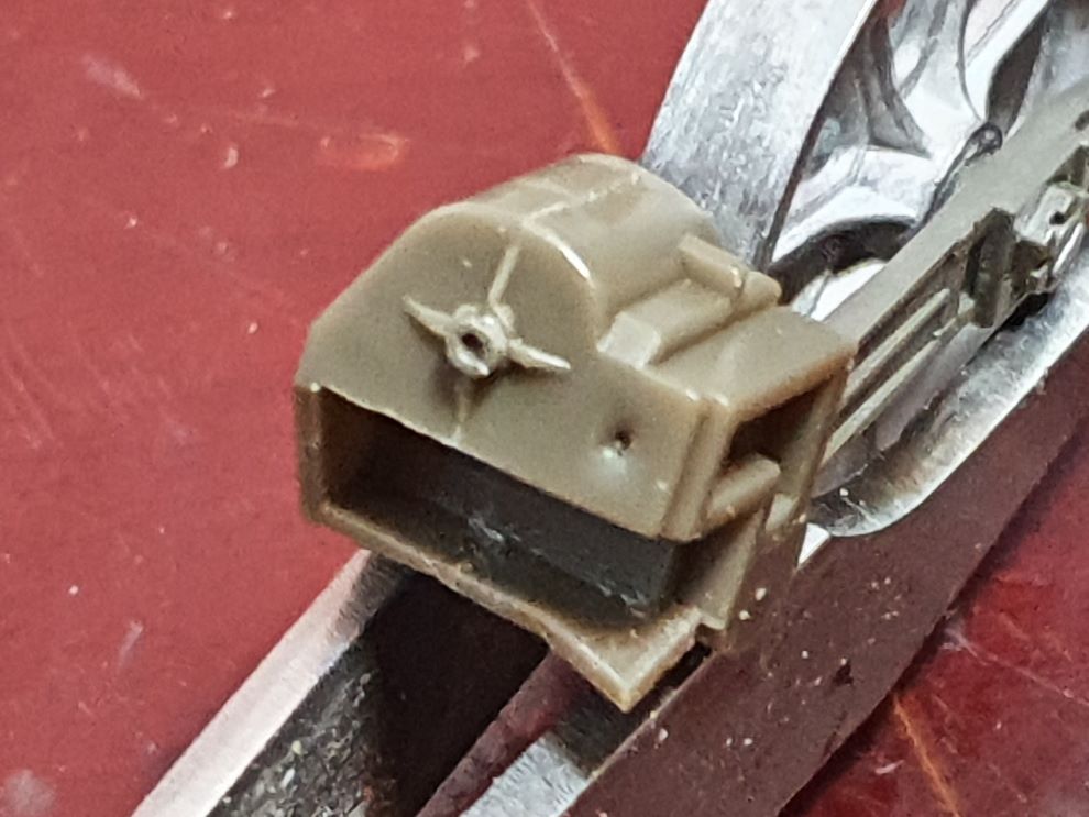 두꺼운 에나멜선은 지지대이고, 희멀건 부품은 AA 컨버젼으로 몰드가 좀 별로입니다. 에폭시퍼티로 변속기 커버를 만들고, 탄약통 수납랙은 프라판으로, 여분 부품을 가공하여 공구상자를 만들었습니다.