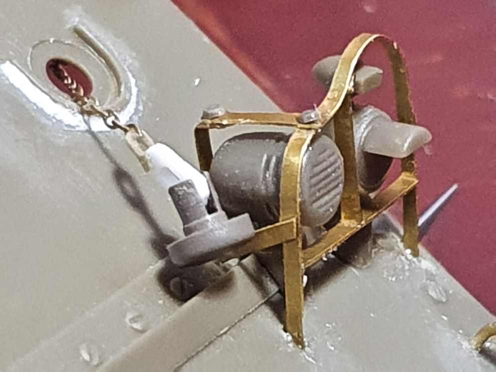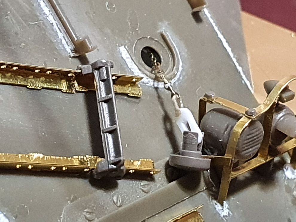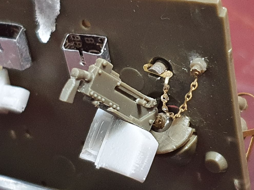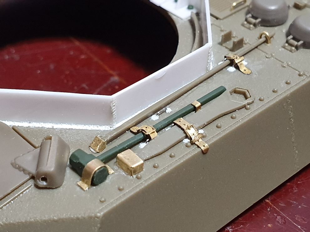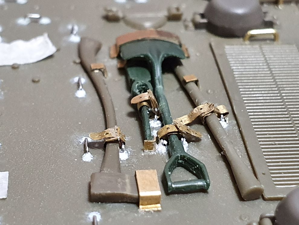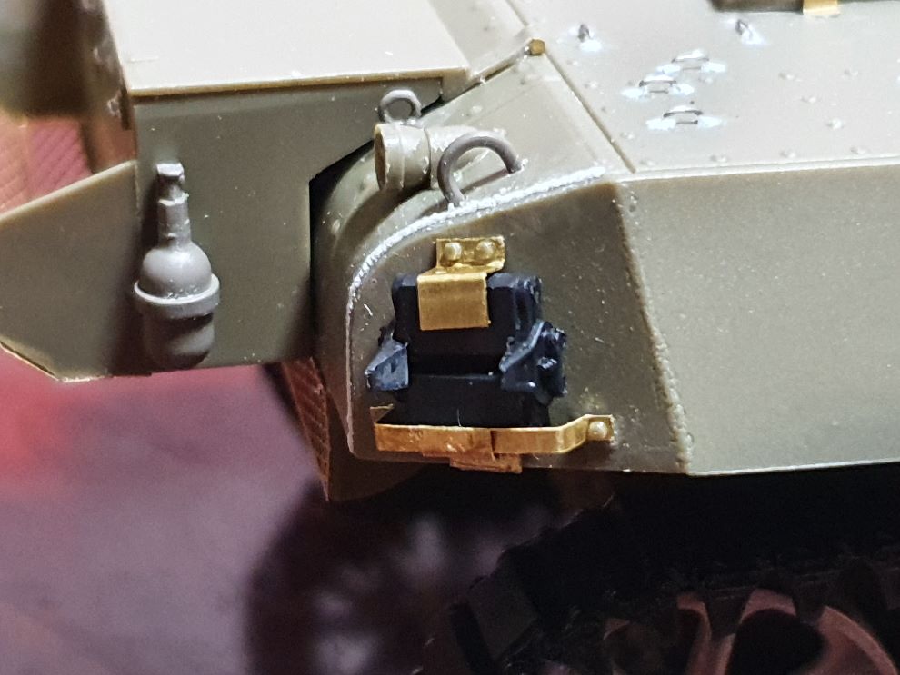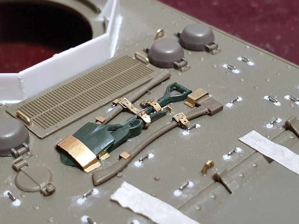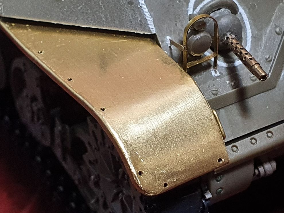예비 트랙용 고정 부분은 황동판으로 만들었습니다. M5A1에서와 달리 후방 펜더가 없어서 예비 트랙이 아래로 추락하지 않도록 하는 철판이 추가되었습니다..