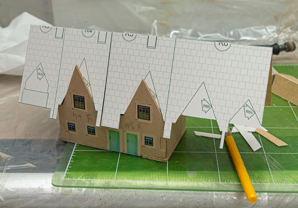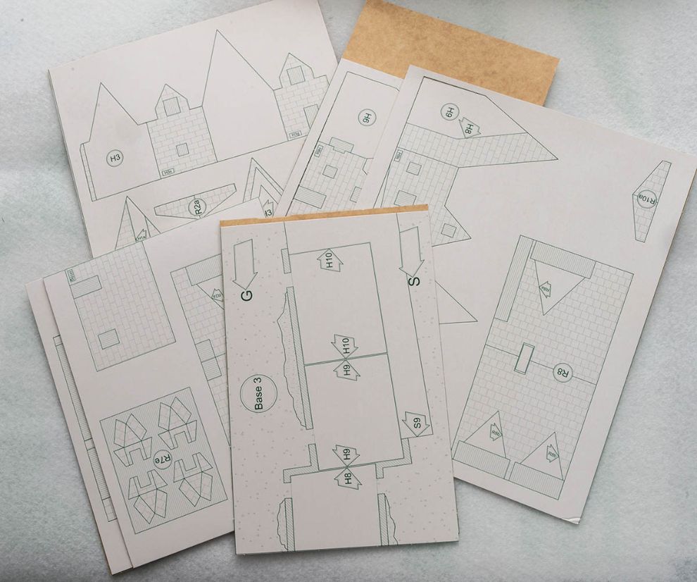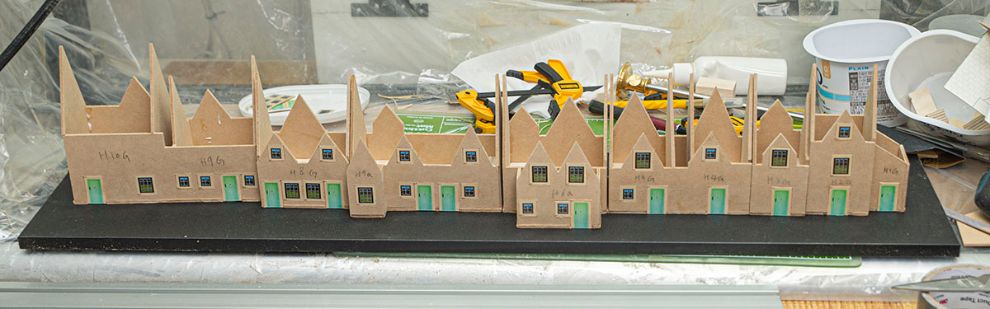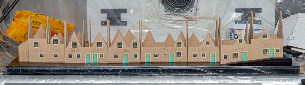 맨 마지막 9번 10번 건물은 살짝 언덕을 타고 올라가는 구조라 어떻게 할지 고민했는데, 디오라마를 배제하고 그냥 위와 같이 깔끔하게 아크릴로 언덕길을 만들어 줬습니다. 여기도 45도 면치기 가공을 해서 아주 깔끔하게 만들려고 했는데 귀찮아져서 빨리 넘어가기로 했네요.