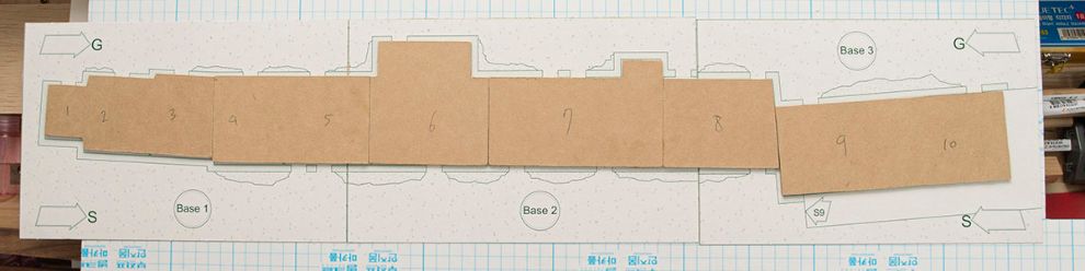 밑판을 스캔해서 CAD 도면으로 그리고, CNC 로 MDF 를 오려내서 만들었습니다. 참고로 각각의 Base 하나의 크기는 270x175mm 로, 다 합치면 810x175mm 가 됩니다.