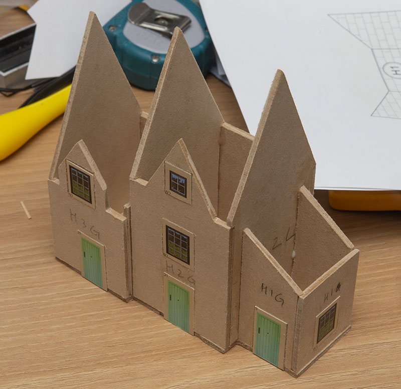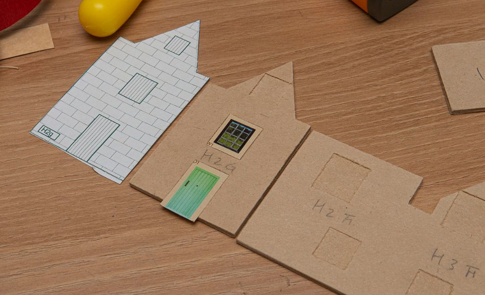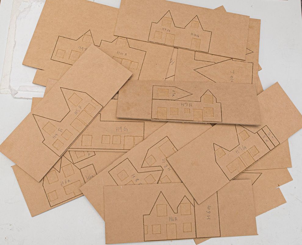 원래는 문과 유리창을 잘라내고, 안쪽에서 문과 유리창 텍스쳐를 풀로 붙이는 형식입니다만 CNC 로 바꾸니 그렇게 하기엔 두께 때문에 문제가 발생하더군요. 할 수 없이 2.5D CNC 로 위와 같이 유리창과 문이 들어갈 부분만 0.5mm 더 파주도록 했습니다. 덕분에 작업시간이 3배 더 길어졌네요 ㅠㅜ