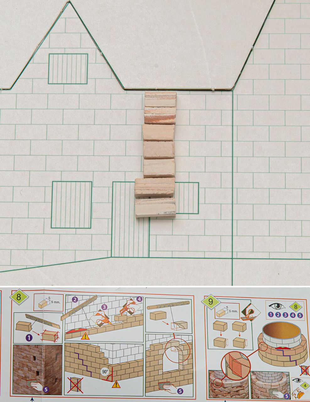 설명서를 보다시피, 돌은 무작정 쌓아올리면 안됩니다. 특히 세로로 직선으로 쌓으면 절대로 안되고, 무조건 밑줄과 윗줄의 세로 선이 엇갈리게 해야 합니다. 가능하다면 위의 도면대로 규격화된 벽돌을 가지런히 쌓아올리는 것이 가장 이상적이겠지만, 사진을 보다시피 벽돌 사이즈가 전부 제각각이고 색깔도 제각각이라 그렇게 통일성있게 조립하는 건 매우 힘듭니다. 또한, 유튜브에 나오는 것처럼 돌과 돌 사이를 투명한 순접으로 막 붙이면 안됩니다. 현실에서 벽돌집 미장이질 하듯 벽돌과 벽돌 사이를 메꿈이로 막아줘야 가장 이상적입니다. 저는 모델링 페이스트로 빈틈을 전부 메꿔줄 겁니다.