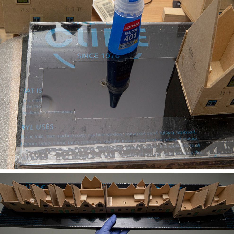 건물의 골격이 되는 MDF 판과 아크릴 밑판의 고정은 순접을 바른 나사로 고정시켰습니다. 정확히 말하면 못이 MDF 3T 와 아크릴판 5T를 지나 맨 밑의 하이그로시 코팅 MDF 18T 속으로 고정되는 식입니다. 이렇게 만들고, 위에 지붕까지 얹으면 나중에 분리 재작업을 하는 건 사실상 불가능합니다.