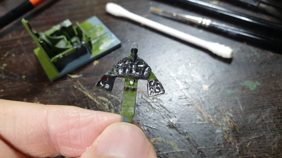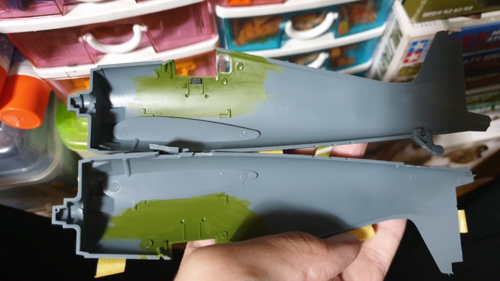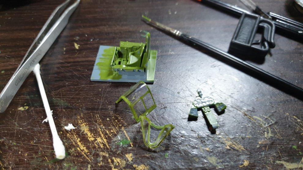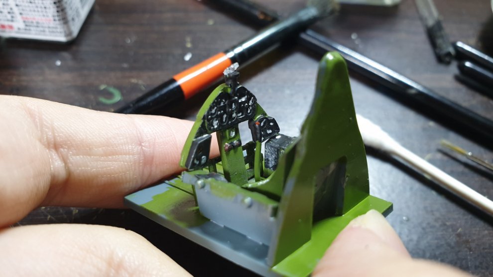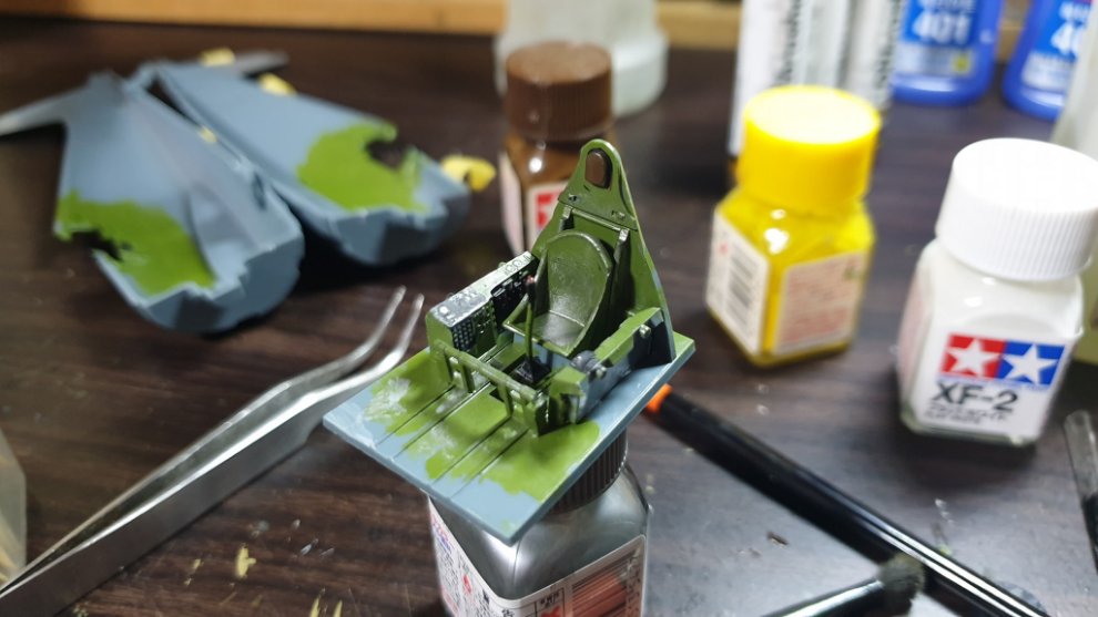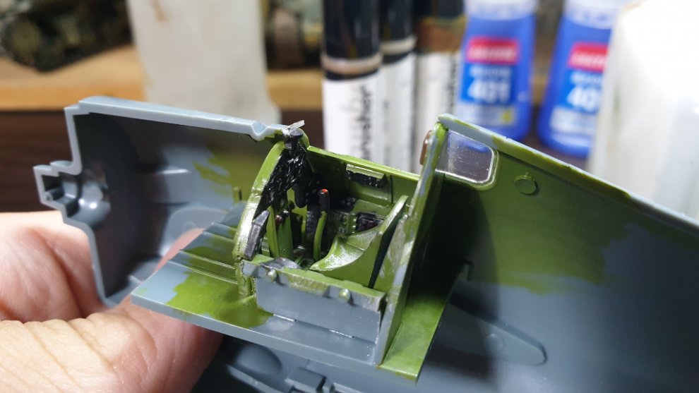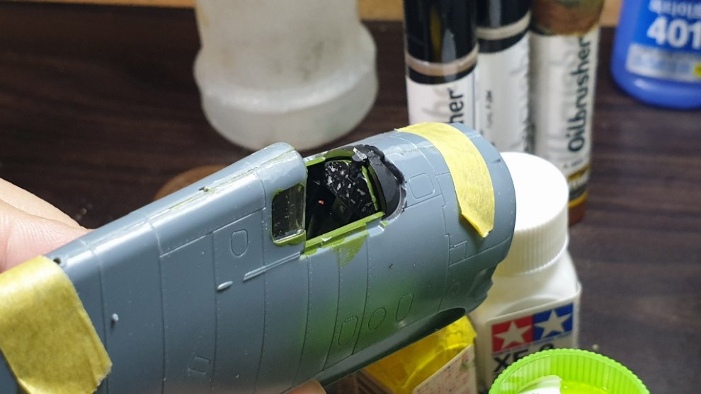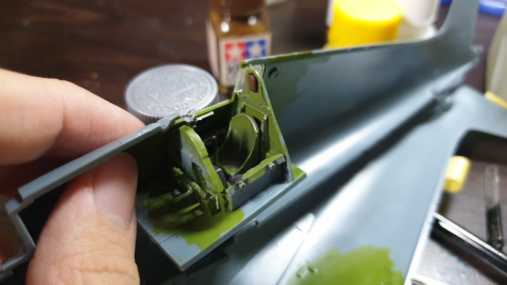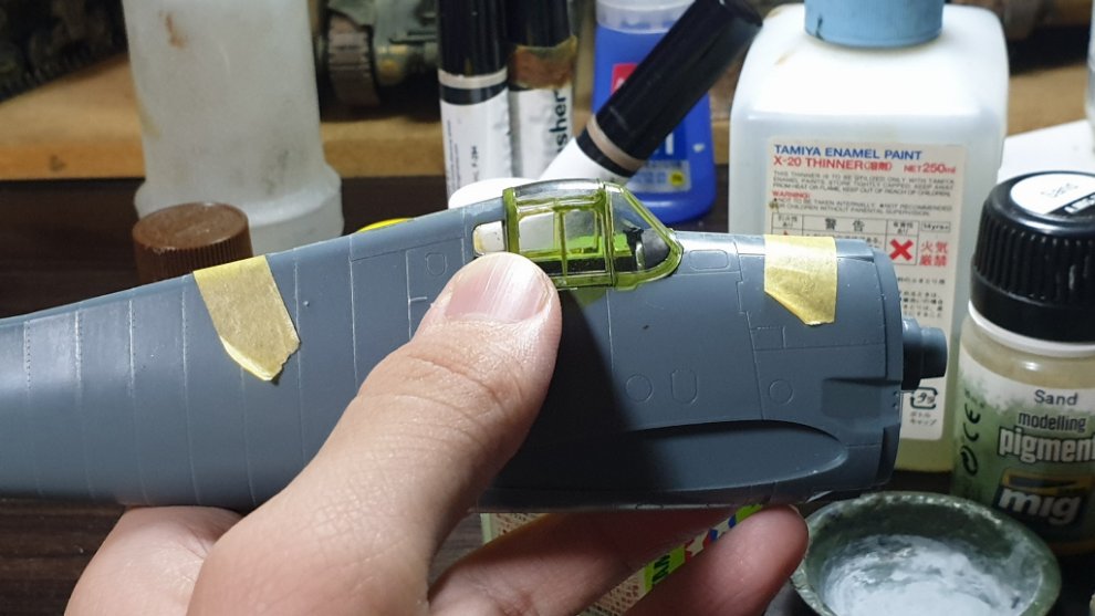 타미야 에나멜 올리브 그린과 타미야 에나멜 노란색과 카키를 섞어서, 조금 자연스러운 색감을 내기 위해 노력했습니다. 그리고 캐노피에 살짝 도료가 묻었는데 컴파운드 피니시를 면봉에 살짝 묻혀서 살살 문질러줘서 닦아내고 비눗칠로 물에 닦아주었습니다.