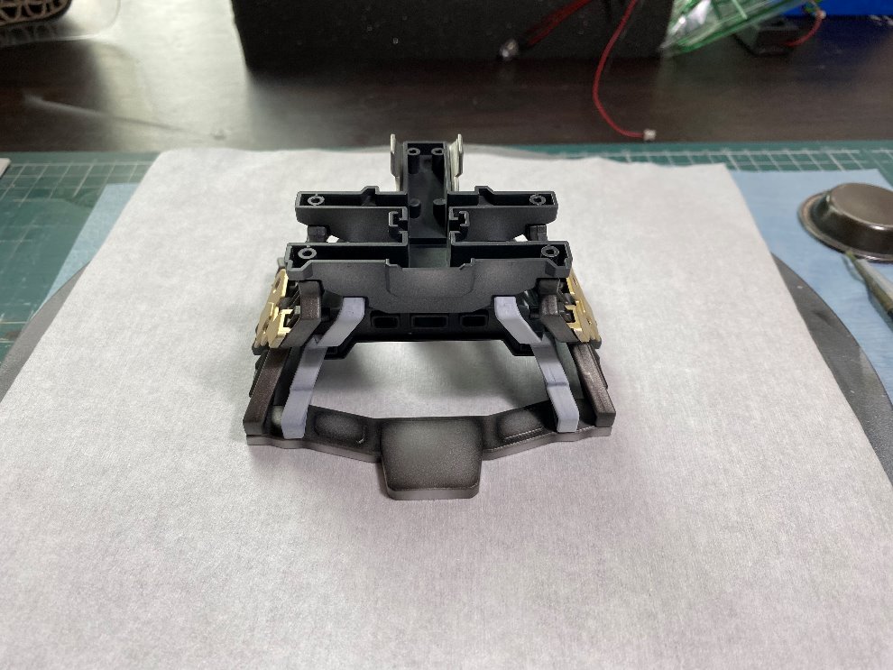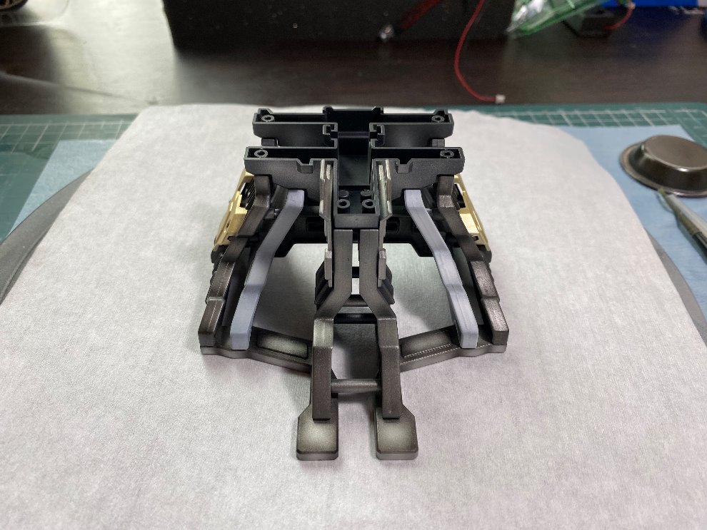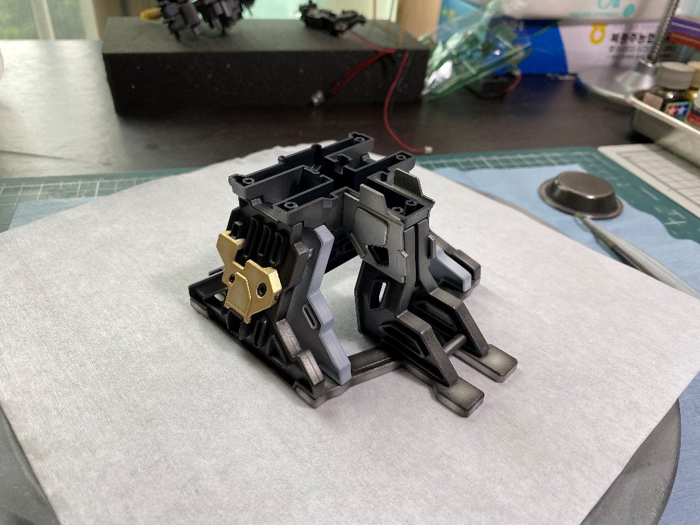 제일 먼저 가베라의 헤드를 받쳐줄 베이스의 프레임부터 작업을 시작했고요, 도료는 래커, 에나멜 두 가지다 혼용을 했습니다. 메탈릭 계열의 색들을 모두 동원해서 일정한 패턴 없이 중구난방식으로 (좀 더 메카닉 느낌이 나도록) 도색을 했습니다. 물론 명암 작업도 같이 이루어 졌고요, 마감재까지 도포하고 베이스를 마무리했습니다.