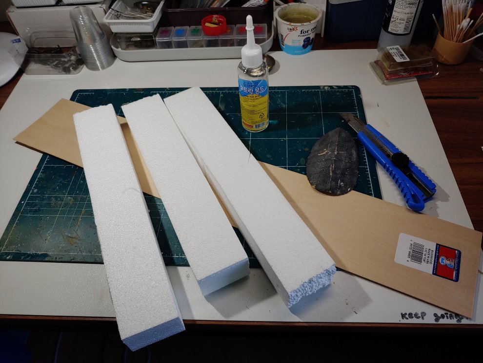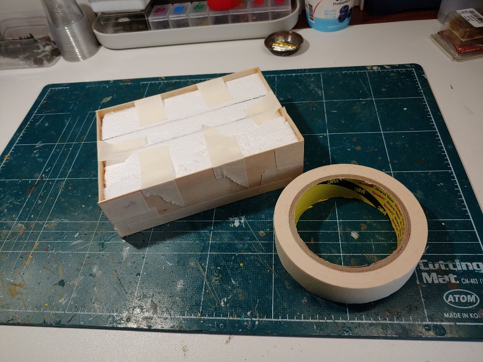 요즘 제작서적을 보면 아이소핑크를 많이 쓰던데 일단은 스티로폼을 사용하는 걸로...제작 후 스티로폼 가루가 날리고 이를 청소하는 것이 귀찮았습니다만, 뭐 공짜로 얻은 것이니...아무튼... 화방에서 사온 발사판으로 감싸줍니다. 너무 얇은 걸로 골랐네요. 다음엔 좀 두꺼운 걸로 골라야겠습니다. 본드를 먹고 막 휘고 난리도 아니네요.