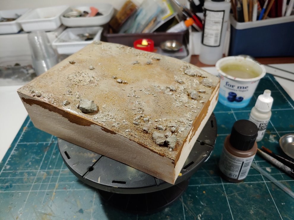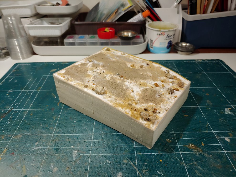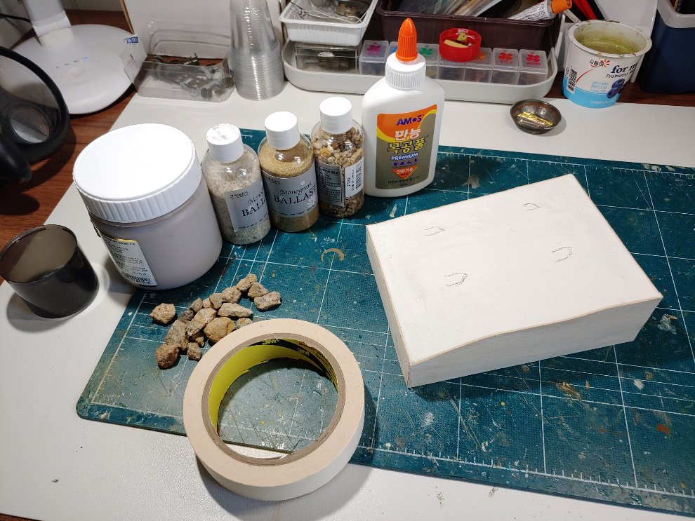 크기가 다른 돌들이랑 모래를 붙여주고 젤스톤도 발라주고 지면 분위기를 내어 줍니다.