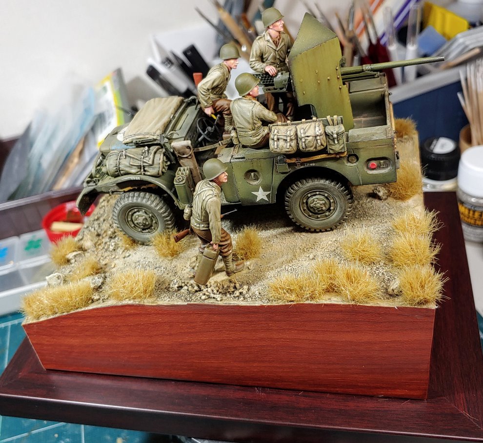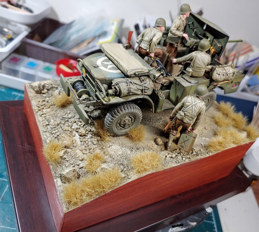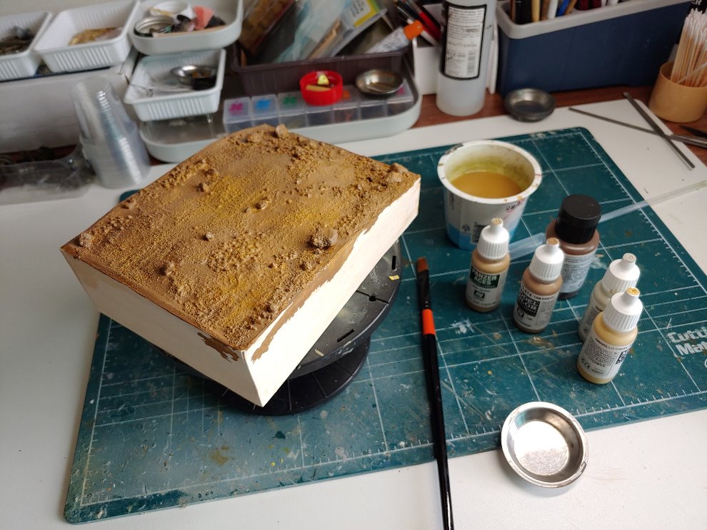 그리고 필터링 하듯이 밝은 먼지색을 올려줍니다. 근데 좀 진하게 올렸네요. 이후로 MIG제 Weathering도료로 먹선 넣기도 더 하고 에나멜로 드라이 브러싱도 하고 여러 가지로 손을 대 보았습니다. 중간에 사진 찍는 것을 잊고 그냥 넘어갔습니다만, Green Stuff World라는 회사에서 나온 풀들을 붙여줍니다.
