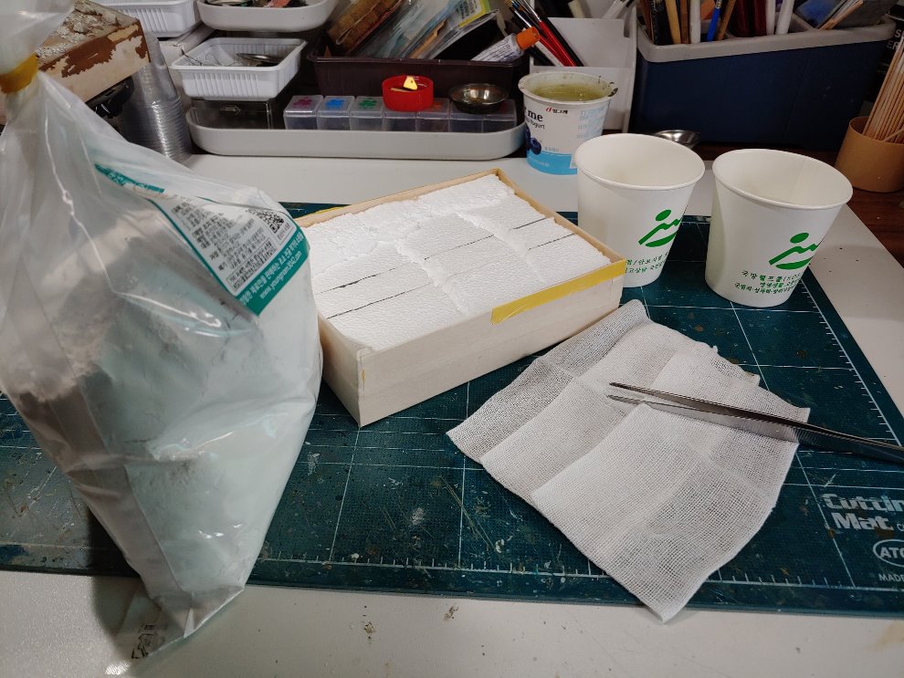 본드가 굳은 뒤에 석고를 부어줍니다. 석고을 올리는 면에 붕대롤 올려 주면 강도가 올라간다는 예전 방법(타미야에서 나온 옛날의 얇은 책들)을 기억해 내어 그대로 해 보았습니다. 튼튼하게 잘 되었습니다.
