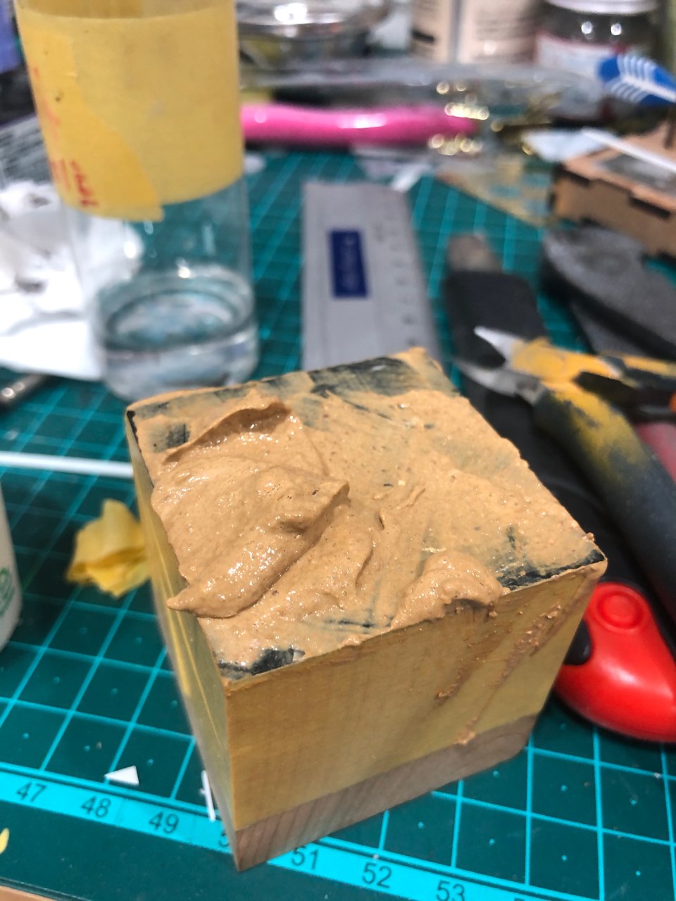 슬슬 바닥을 표현해야하는데요. 빨리 마무리하기위해 건조가 빠른 겔메디움과 피그먼트를 활용해서 나무베이스에 덕지덕지 발라주었습니다.
