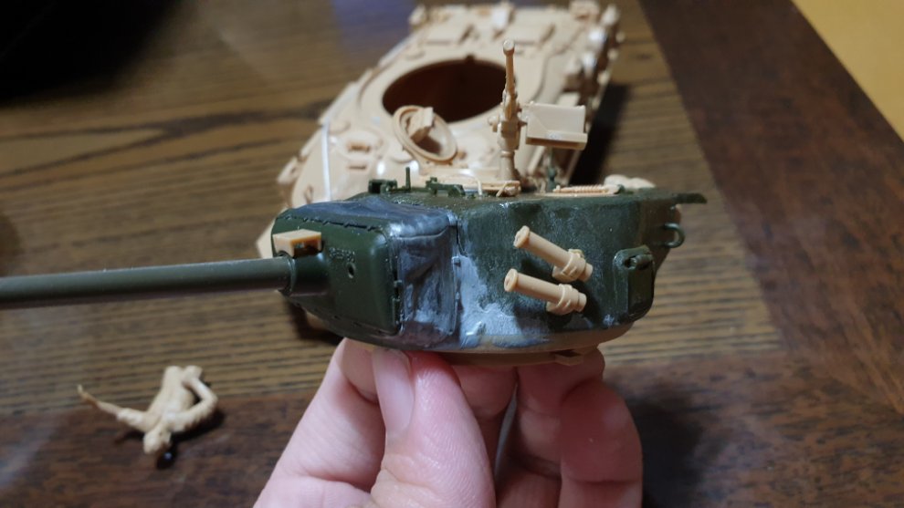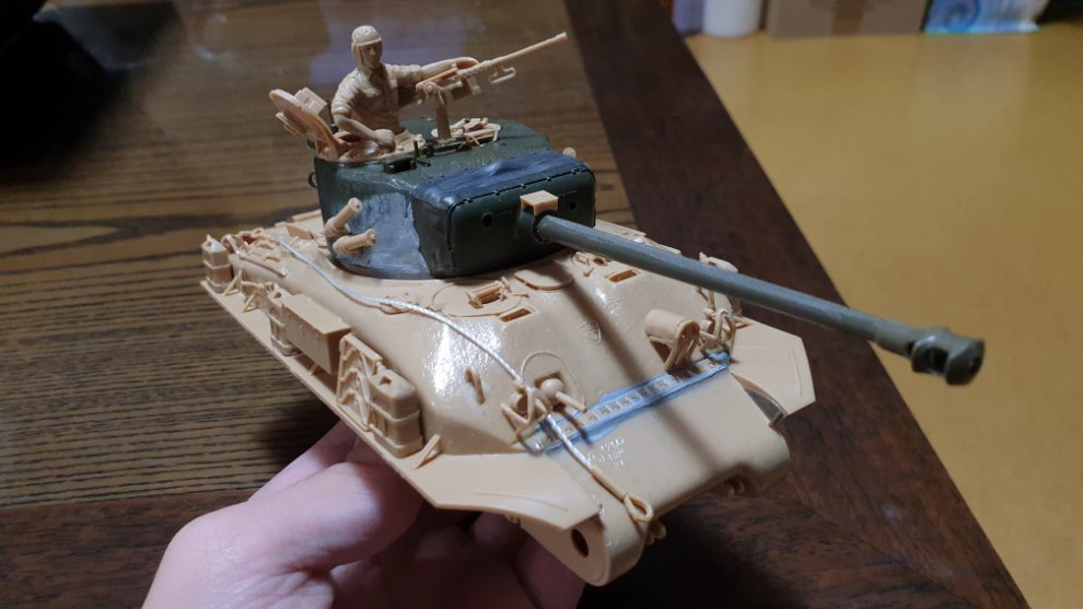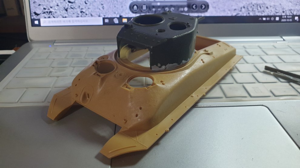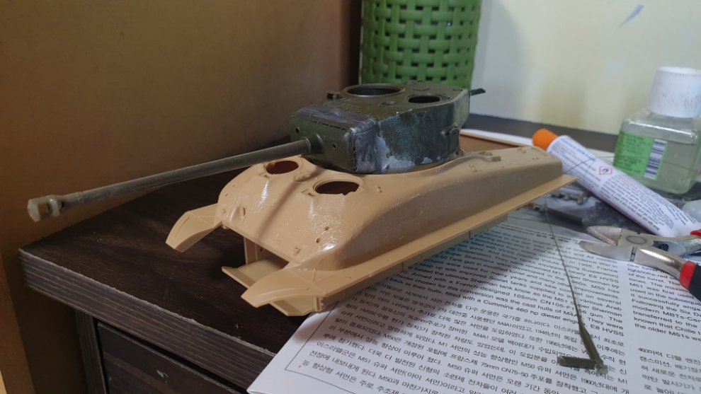 퍼티를 사포로 열심히 갈아서 밋밋하게 만들었습니다. 이스라엘군의 도져 셔먼(댓글에 첨부할께요)을 보니 용접선이 전혀 보이지 않고 오히려 통짜로 다 뽑아낸것처럼 맨질 맨질 하길래 이 상태에서 바로 타미야 수지 접착제로 주조 표현 할 부분에 펴바르고 손가락으로 꾹 꾹 눌렀다 땠다 하면서 표현해주었습니다.