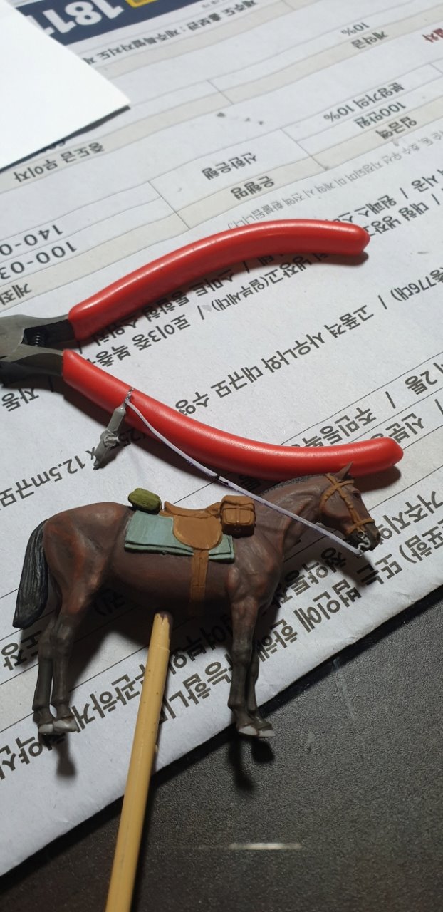 머리가 약간 커보인다는 걸 제외하면 구입하기 잘했다는 생각이 들 정도로 마음에 드는 제품입니다. 마무리 도색을 하기 전에 고삐와 등자 같은 마구를 달아줘야 하는데 처음 해보는 일이라 이것저것 많은 고민을 했습니다.