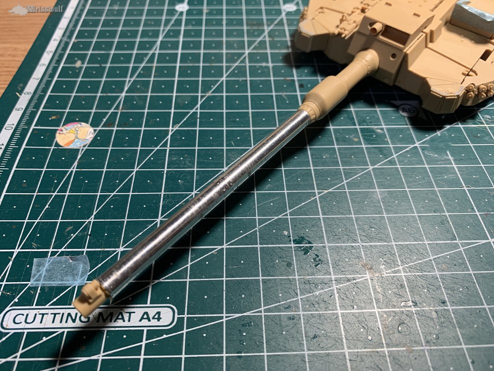 포신은 살짝 휘어져 있길래, AS를 신청할까 하다가 그냥 별매품을 달아 줬습니다. 포구 끝 키트 부품을 붙여야 하는 부분에 접합핀 등이 전혀 없어 위치/각도 맞추기가 쉽지 않았습니다.