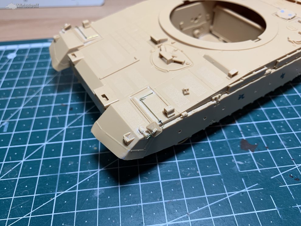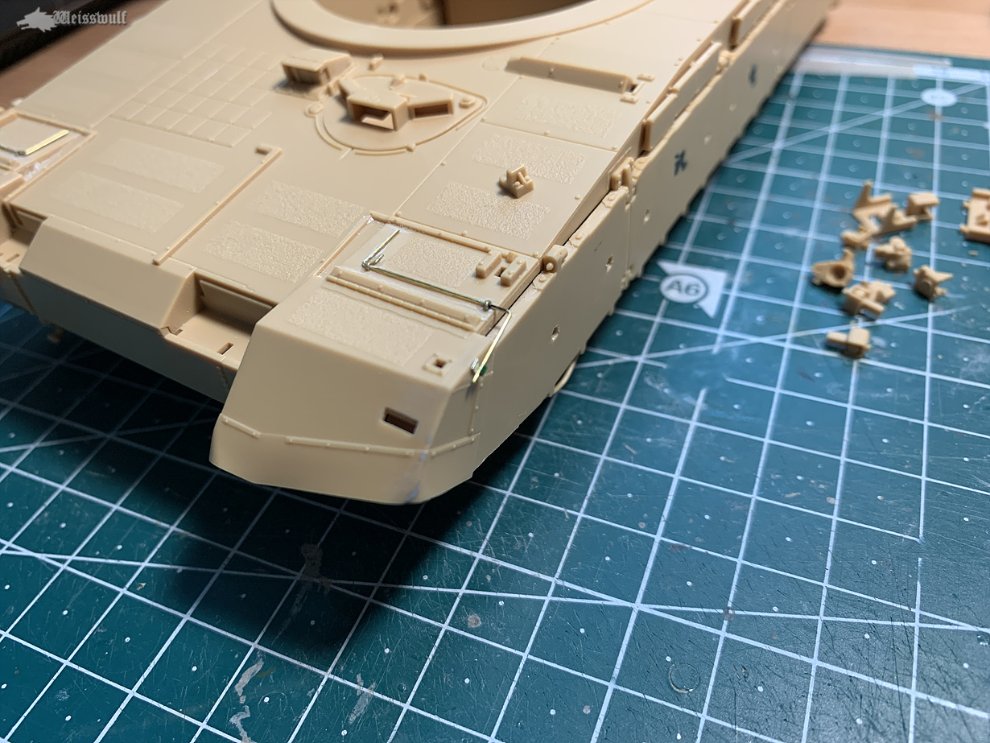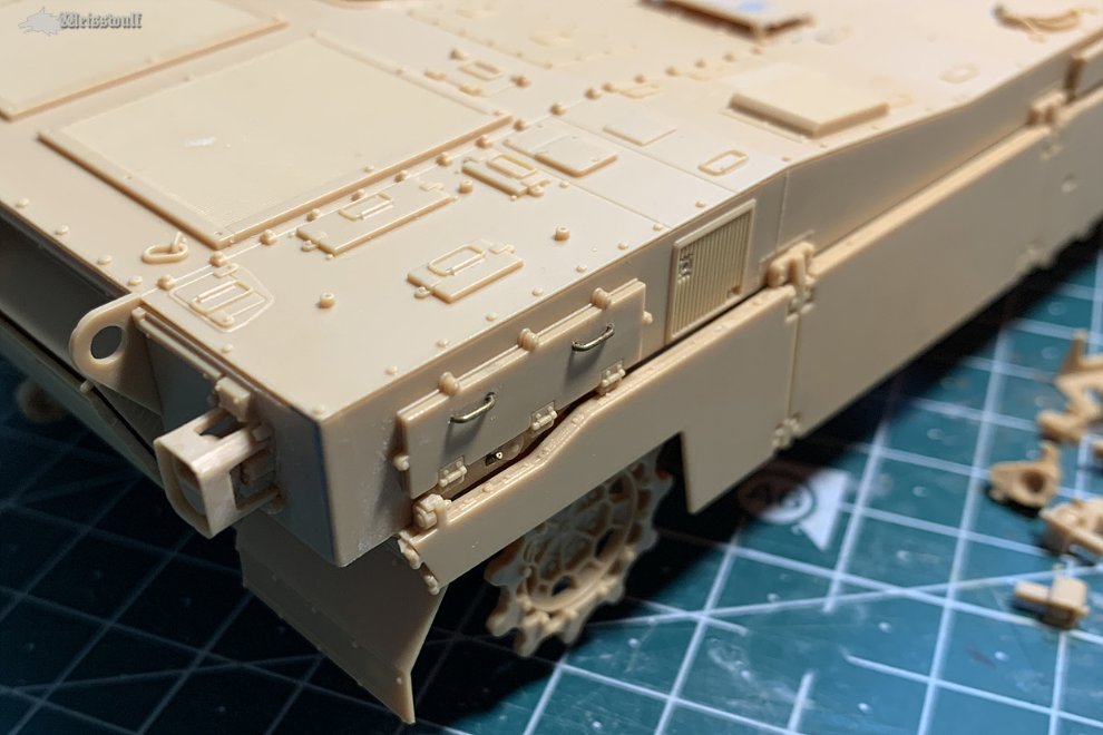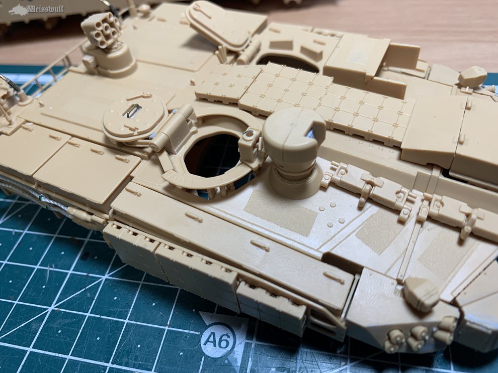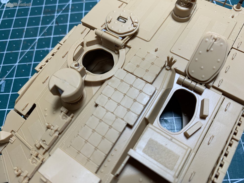 K1이나 M1전차와 마찬가지로, 전차장해치의 암(Arm)부분은 밀폐했을때와 개방했을때 해치와의 각도가 바뀌게 됩니다. 그냥 닫은 상태로 조립할때는 별 상관 없겠지만, 해치를 연 상태일 때는 사진자료를 잘 참조하는게 좋겠습니다.