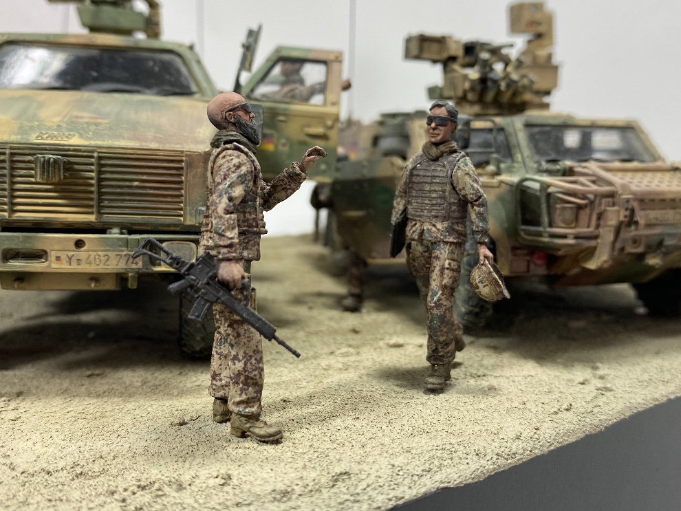 2017년에 태어나서 처음으로 시즈오카호비쇼에 참가하여 일본의 4대모형지 필진들이 활동하고 있는 CrossRoads의 부스에서 작은 디오라마를 전시했었습니다. 제작은 대략 2개월 반 정도 걸렸었고, Revell과 Trumpeter의 독일연방군 차량에 독일 로컬브랜드인 Y-Modelle의 개조세트와 Dolp Modellbau의 화이트메탈제 인형을 써서 만들었습니다. 복잡한 독일연방군의 사막위장복인 Steppentarn은 한국의 크로스델타에서 발매된 데칼을 사용하였는데, 최근 몇년사이에 제가 만든 인형들의 위장복은 전부 크로스델타 제품을 사용하여 작업속도가 빠르고 어렵지 않게 정확한 패턴을 구현하고 있습니다.