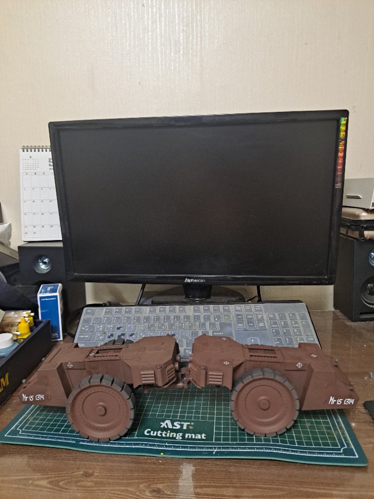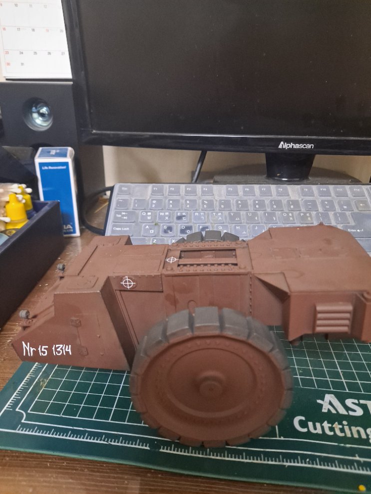 앞에서 말씀드린 타미야 아크릴 다크 아이언을 밑색으로 뿌린 후 미그 원샷 프라이머 산화갈색을 뿌려줬습니다.