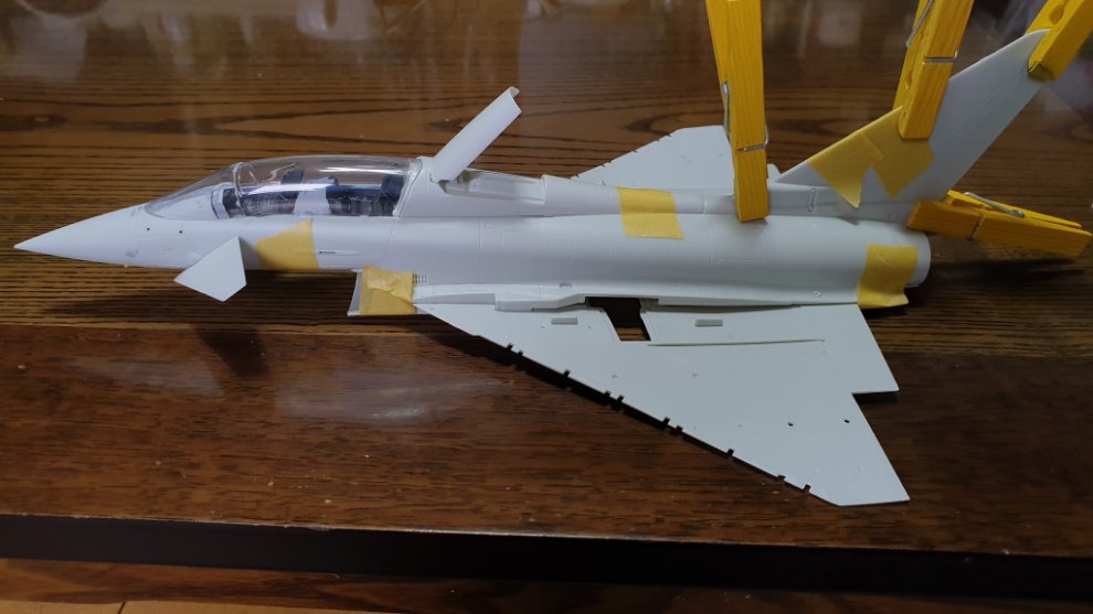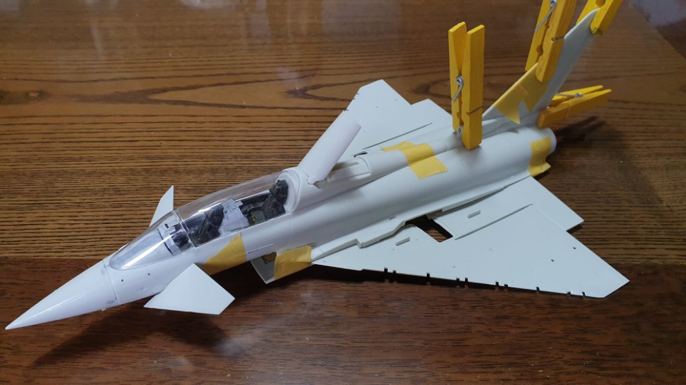 내일 쯤이면 이제 때어내도 되겠죠? 만들땐 "어후 이게 안붙냐 진짜 빡치네!" 하면서 화났는데 정작 해놓고 나니까 뿌듯하고 제가 아는 그 모습이 나오는것이 흐뭇합니다. 이게 항공기 제작의 매력인 것 같습니다. 그러고보니 이 복좌형 타이푼은 훈련용이더군요.
