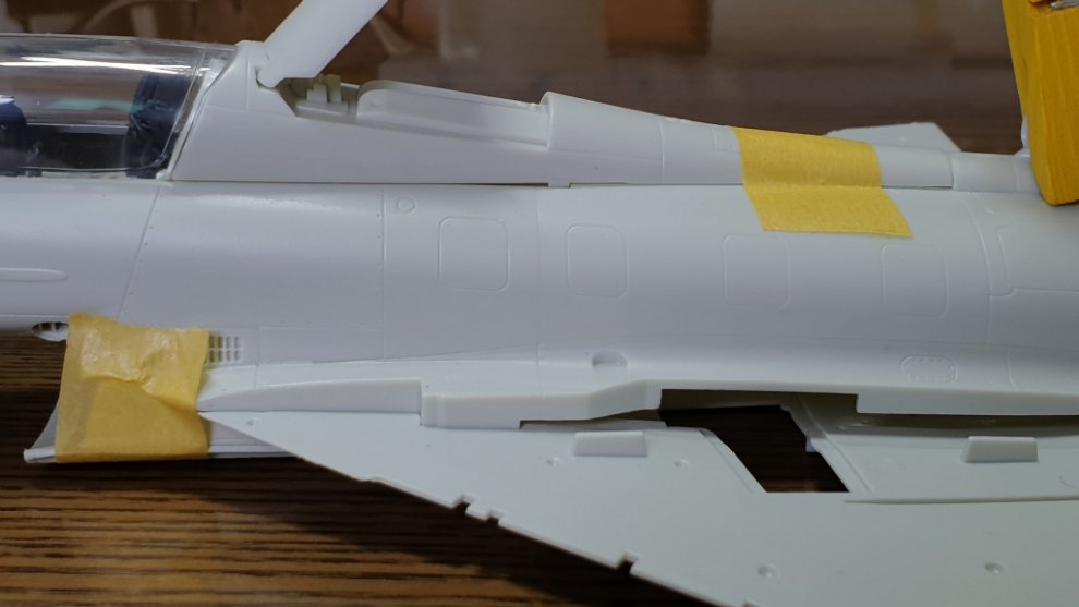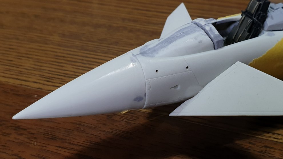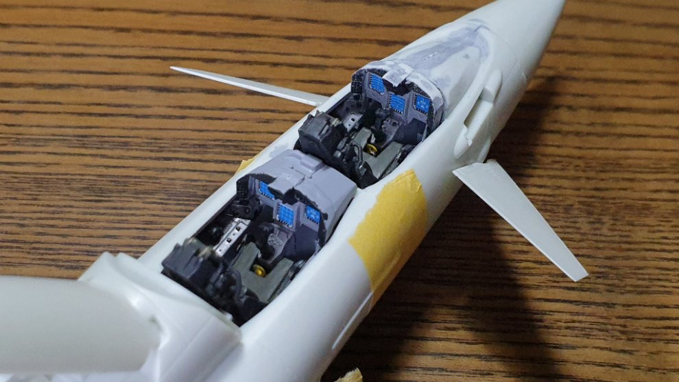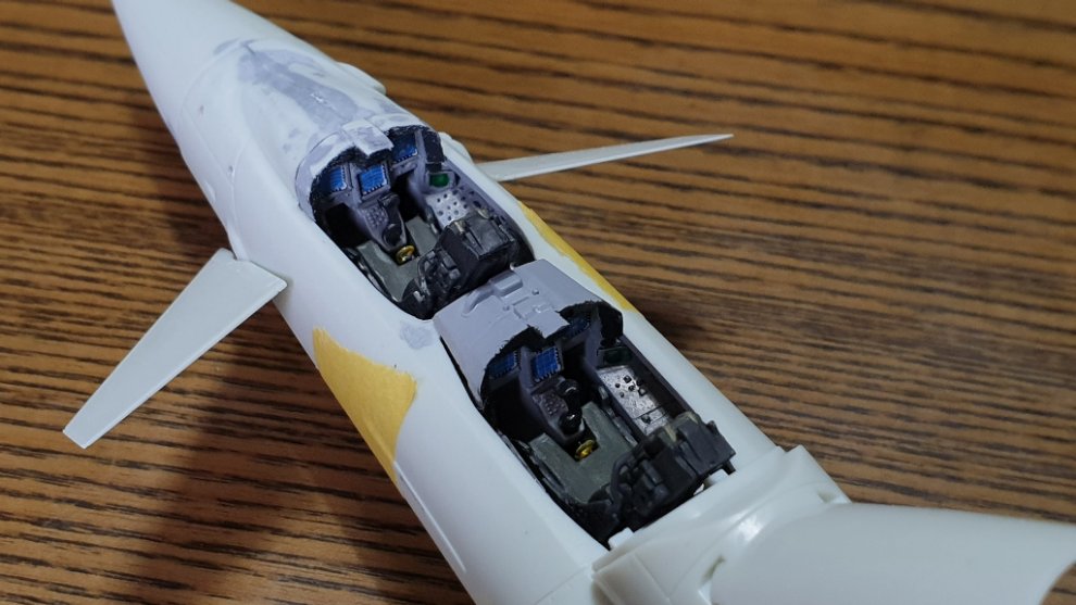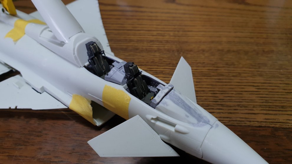 도색의 편의성을 위해 아직 사출 좌석은 접착하지 않았고, 계기판 앞쪽에 보이는 저 큰 단차는 순간 접착제까지 동원해서 매꿨습니다.