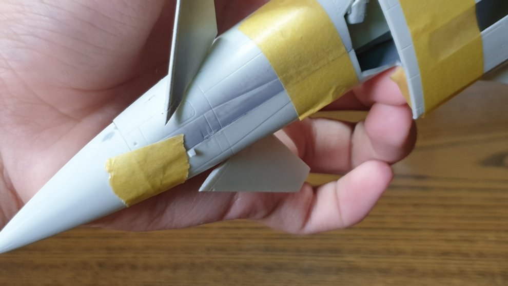 그런데 기수 하부에 단차가 좀 크네요. 레이돔과 기수를 연결하는 마스킹 테이프 때어내면 그게 좀 흉할 정도로 심한 모습이 보입니다. 결국 마스킹 테이프로 마스킹하고 퍼티를 듬뿍 듬뿍 발라주는 수밖에... 없겠네요.