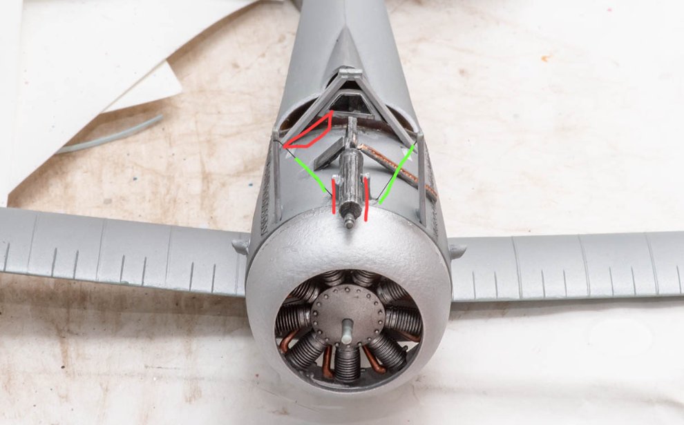 사진 중앙의 빨간선 ∥ 으로 기총을 고정시키는 기믹도 CSM 의 매뉴얼에 보면 나와 있으므로 고증에 맞춰줍니다. 초록색 선은 아카데미 설명서에서 누락된 리깅실입니다.