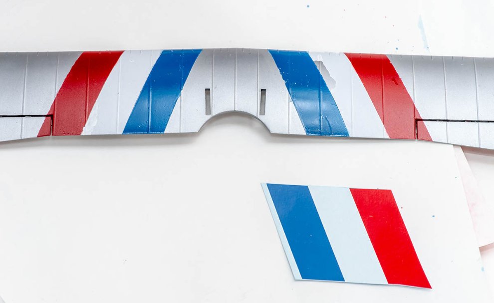 9. 그래도 일부 데칼은 좀 힘들었는데요. 샤를 뉘게세 데칼은 꽤나 넓어서 이리저리 맞추다가 찢어져버렸습니다. 배경색을 칠해주지 못해서 맘에 안들은 것도 있고 말이죠. 그래서 결국 색상을 맞춰 마스킹 테이프를 바르고 도색해줬습니다.