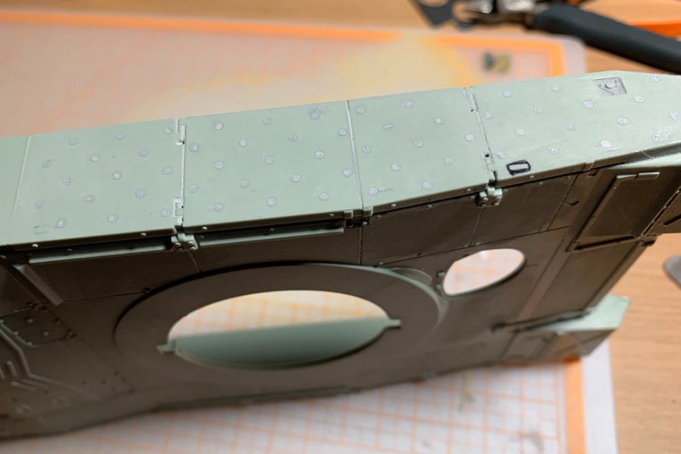 차체 스폰슨과 엔진상판 곳곳의 미끄럼 방지 몰드는 깨긋하게 밀어내고, 그 와중에 밀려 나간 볼트 머리도 다시 심어 줬습니다. 사진에서는 아직 손을 안 댄 상태이지만, 3,4번 스커트 위쪽 스폰슨의 앞뒤로 길다란 직육면체 몰드도 제거해 줘야 합니다.