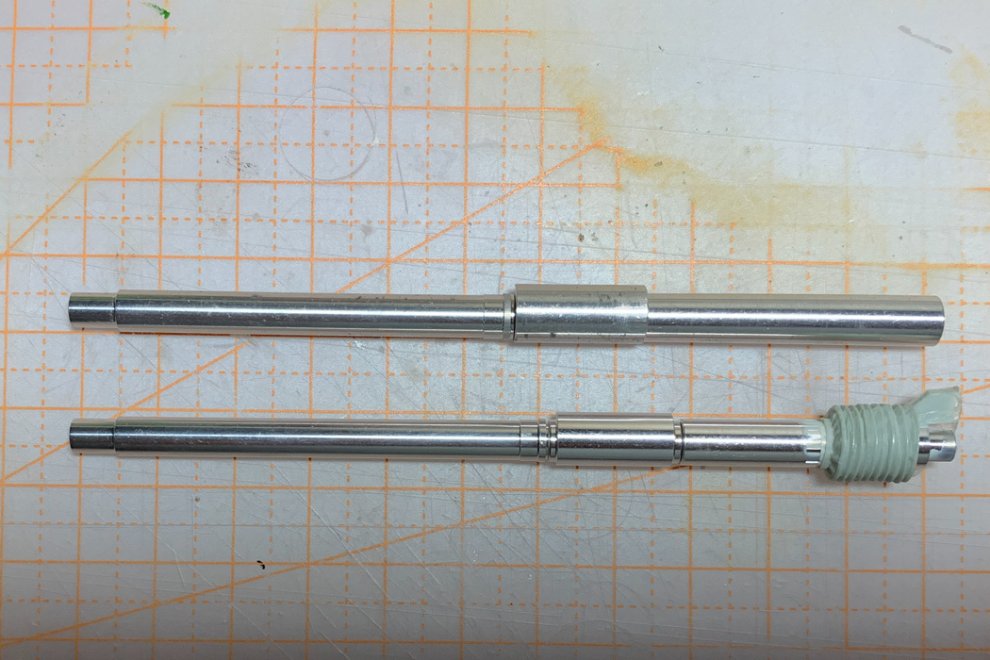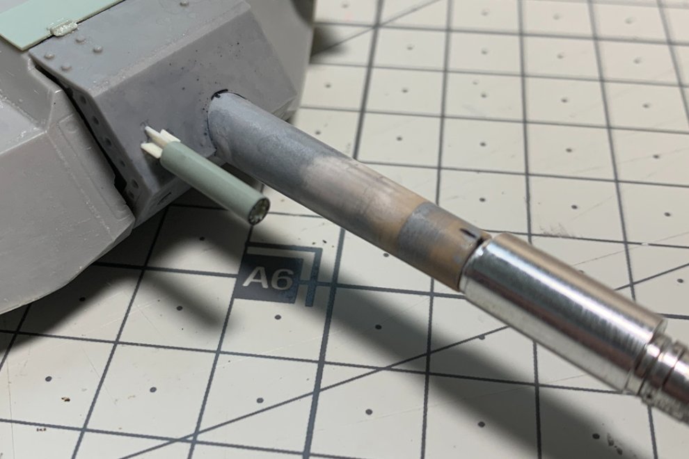 위는 하비갤러리 키트에 들어있는 KM68A1 105mm 주포, 아래는 DEF모델의 M68A1 late 주포입니다. 굵기와 비례가 꽤 차이납니다. 제 눈에는 DEF 주포가 더 좋아보여 이것을 사용하기로 했습니다만, 배연기 후방은 M60A3전차와 모양이 달라 그대로 쓸 수 없어 적당한 플라스틱봉을 가공해 만들어 줬습니다.