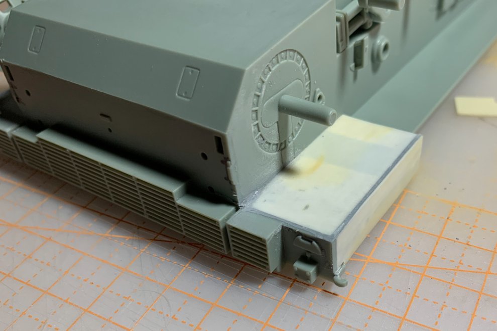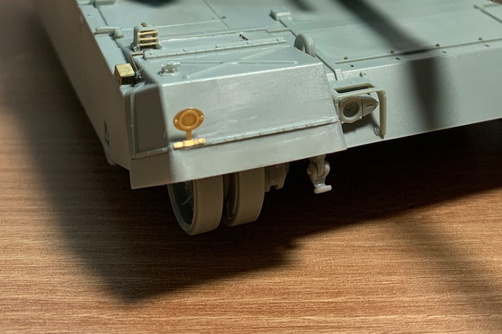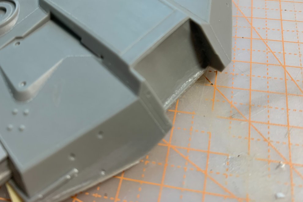 아카데미 키트의 차체 전면은 장갑 양 끝이 전방펜더 고무 흙받이에 파먹힌 모양으로 잘 못 나와 있습니다. 프라판으로 파먹힌 부분을 메워 줬습니다.
