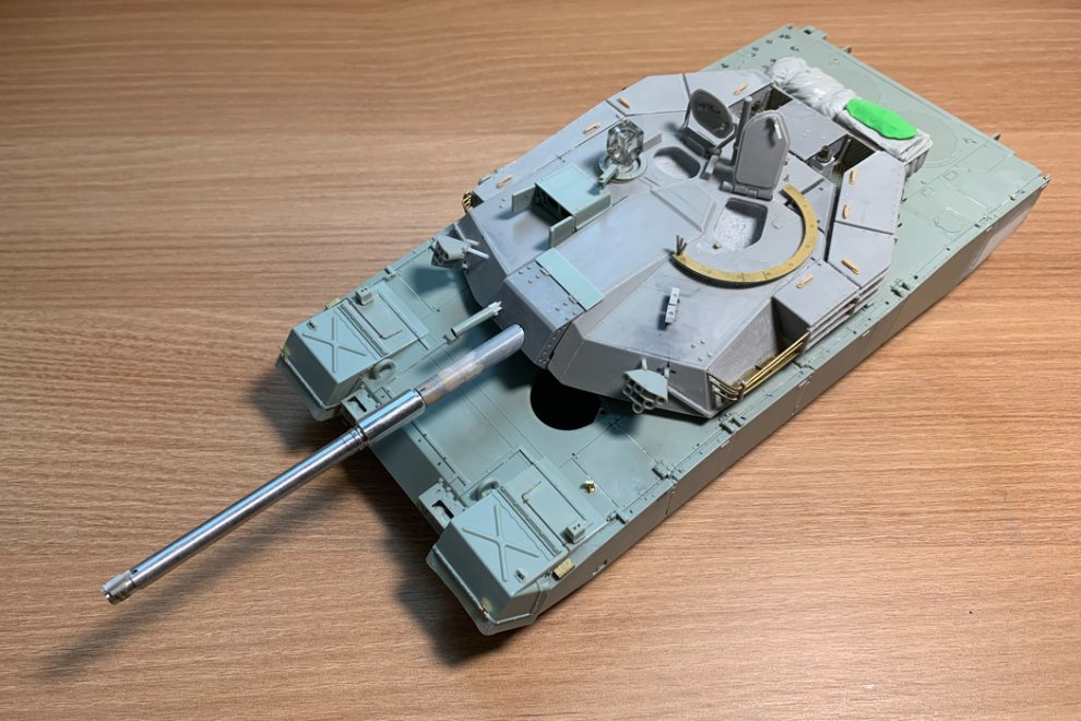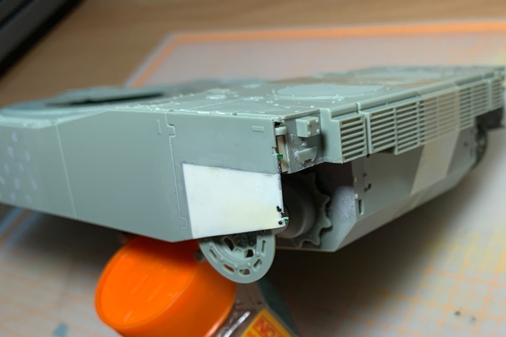 포방패 하단이 너무 짧은 것 같습니다. 아카데미 K1A1도 금형을 개수하면서 저 포방패 자리 파진 부분이 포탑링에 바짝 붙도록 수정됐죠. 사진은 못 찍었지만, 포방패 하단을 연장하고 포탑쪽은 그만큼 살을 깎아 내 줬습니다. 포탑 우측 아래쪽은 복제할때 실리콘 틀이 어긋났던지 단차가 크게 생겨서 프라판으로 메우고 잘 다듬어 줬습니다.