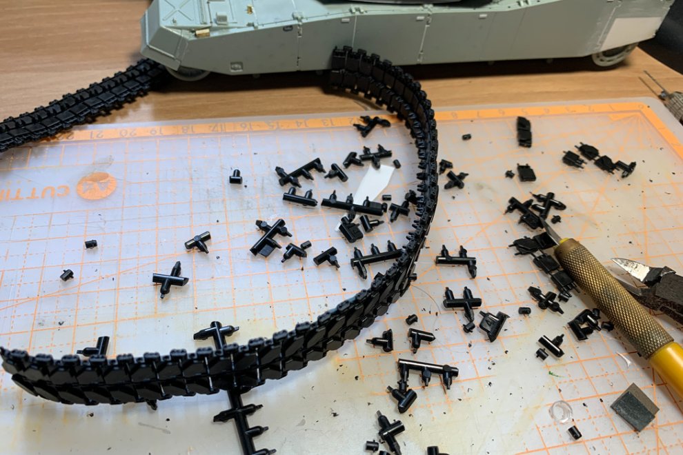 궤도는 레전드 K1A1 키트에 들어있던 연결식 궤도를 사용했습니다. 트럼페터의 T156인 것 같은데, 요즘 나오는 물건과는 아무래도 차이가 있네요. 사출도 깔끔하지 않고, 핀이 가늘고 약해 잘 부러져 조립이 훨씬 더 어렵습니다. 궤도 중앙가이드는 너무 커서 M1A2와 K2에 쓰고 남은 DEF의 T158 부품을 사용했습니다.