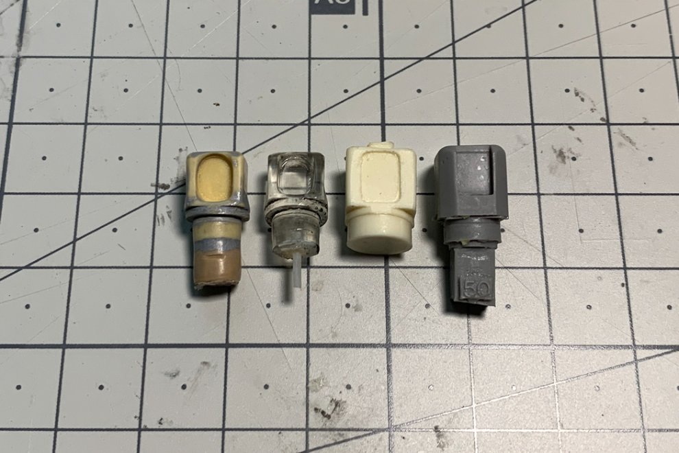 전차장조준경(CPS)부품입니다. 좌로부터 꼬레모형 가공품, 꼬레모형 가공품 투명복제품, 레전드, 하비갤러리 물건들입니다. 하비갤러리는 신형 CPSA1이라 쓸 수 없고, 꼬레모형과 레전드는 같은 VS580을 재현한건데 차이가 많이 나는데다 둘 다 생긴게 시원찮습니다. 그나마 꼬레모형 부품이 레전드 것보다는 크기나 모형이 나아 보여 퍼티를 덧대고 다듬어 모양을 최대한 비슷하게 수정하고, 투명 레진으로 복제했습니다.
