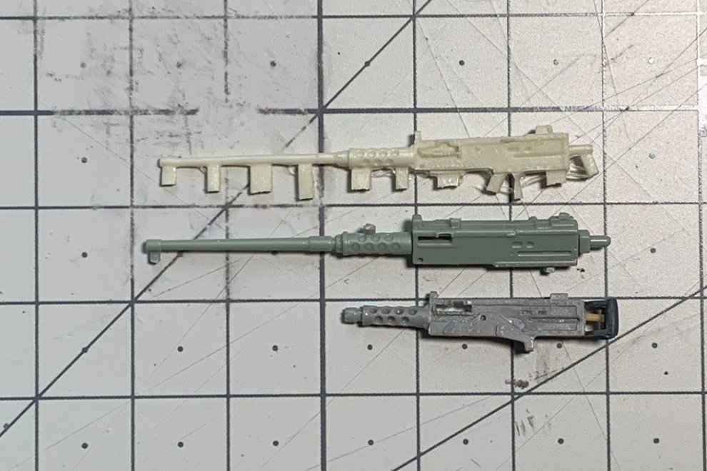 전차장석 M2 중기관총입니다. 위로부터 레전드 별매품, 아카데미 키트, 하비갤러리 키트의 부품입니다. 레전드 별매품은 샤프함이 아쉬운데다 아래쪽 방열구멍이 게이트에 가려 막혀있어 기대에 못 미쳤고, 아카데미 부품은 디테일은 그렇다 쳐도 크기가 너무 커 보이는데다 방열구멍이 좌우대칭으로 몰드돼 있는 오류가 있습니다. 하비갤러리 부품은 레진 부품 답지 않은 수축이 수정하기도 어려운데 나 있지만, 전체적으로 그나마 괜찮아 보여, 수축자국을 살살 잘 지워 주고 사용하기도 합니다.