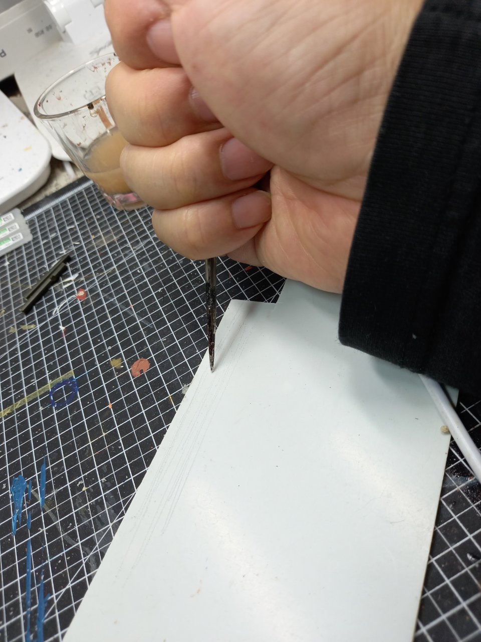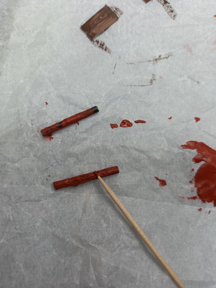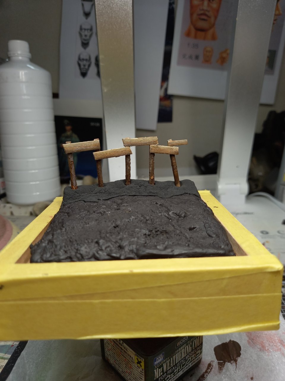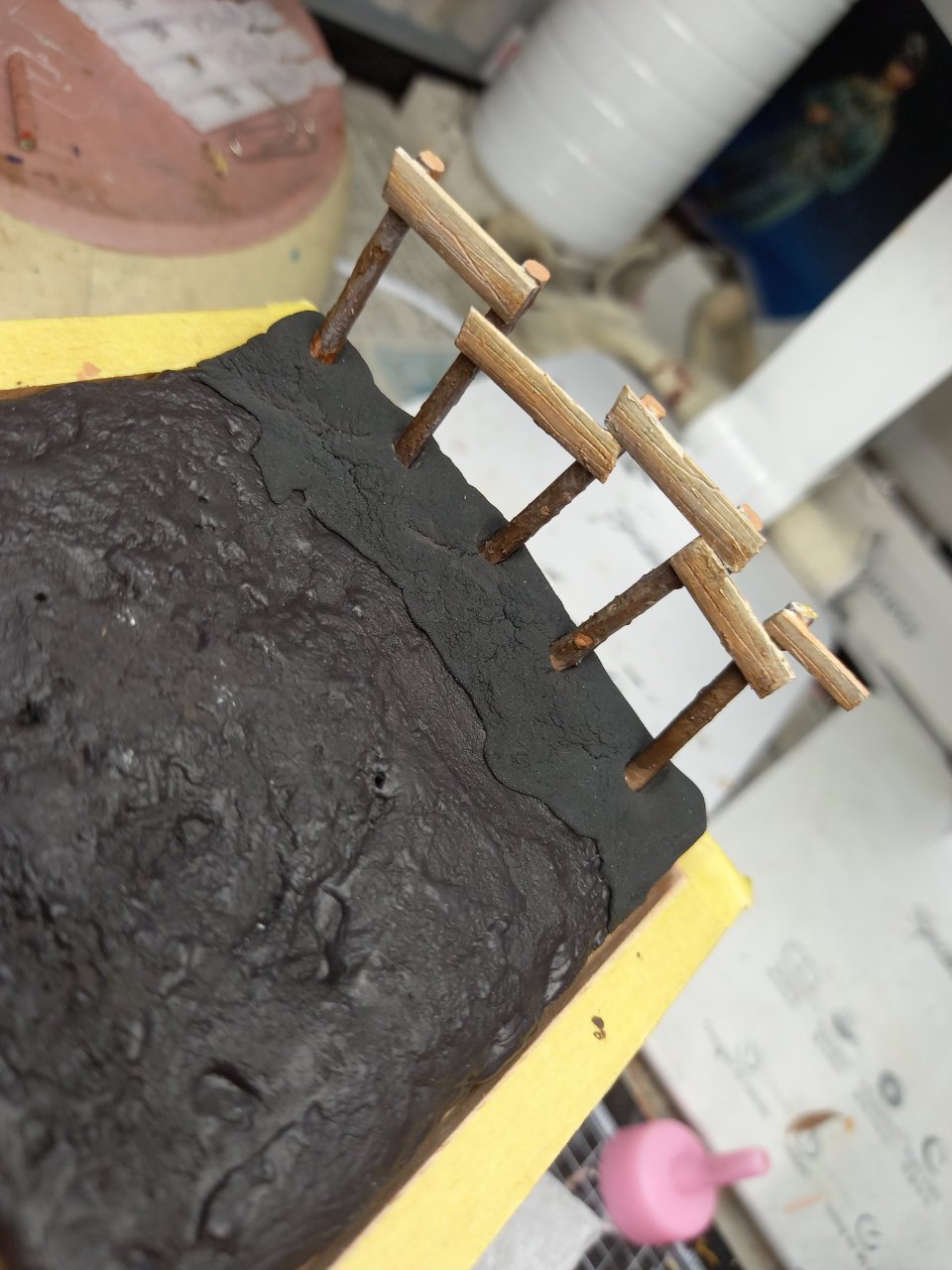 나무기둥에는 퍼티를 받아 반쯤 굳었을때 이쑤시개로 껍질이 벗겨진 효과를 냈습니다.