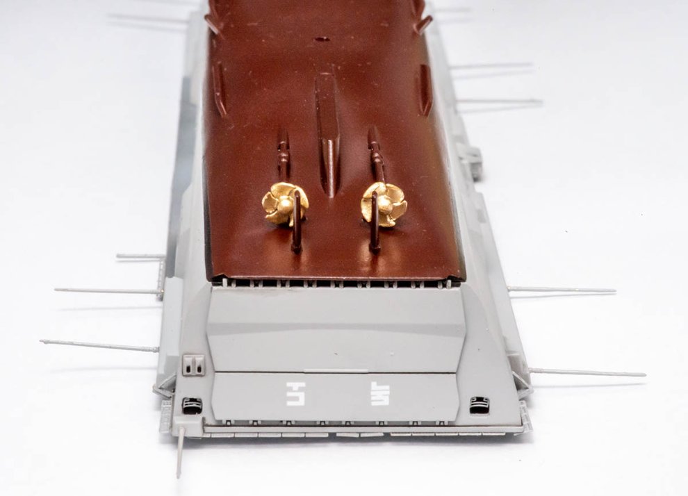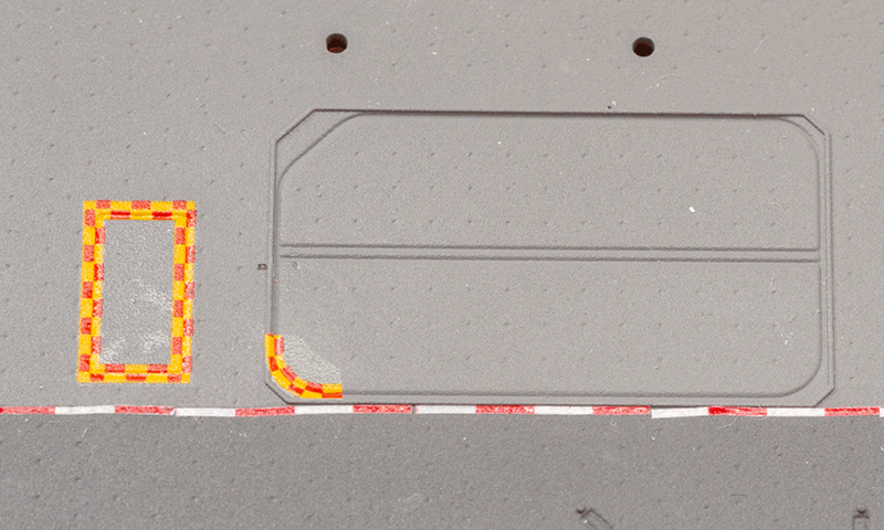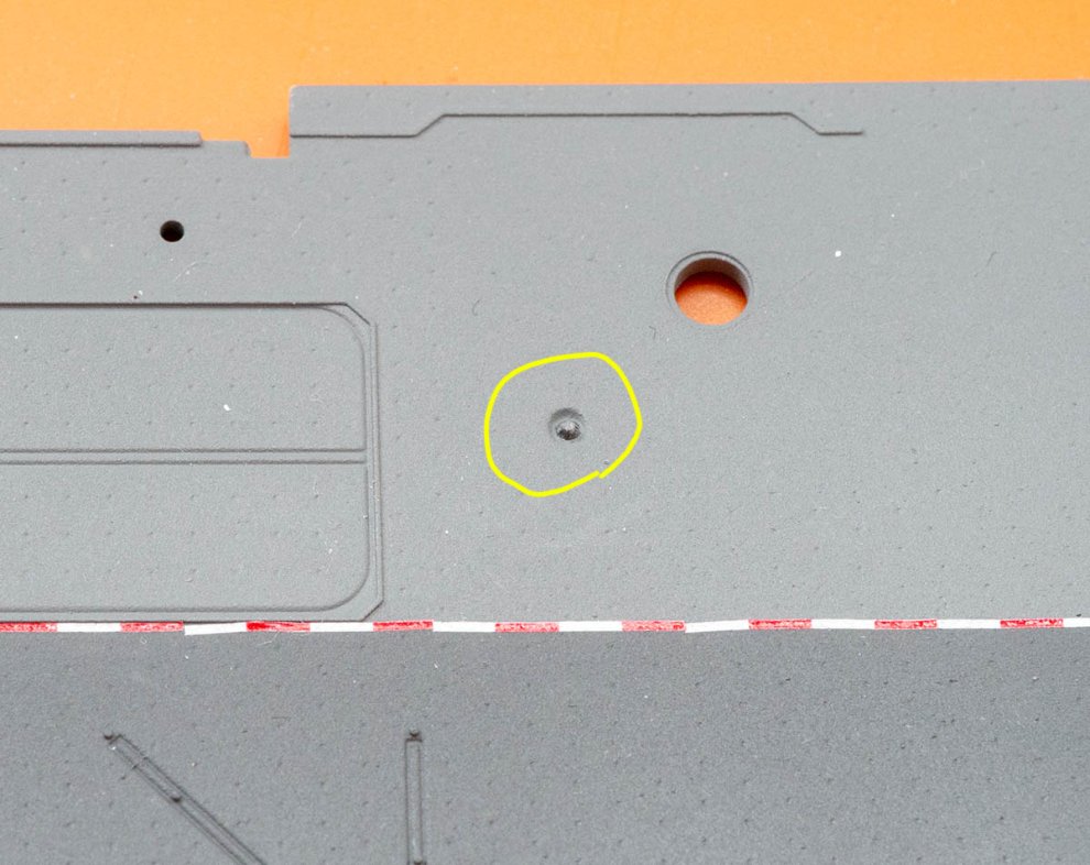 갑판 헬리패드의 야간조명 LED 등 (튀어나온 돌기) 은 데칼 붙일 때 엄청 방해하는 쓸데없는 놈들입니다. 아트나이프로 가차없이 떼어내서 평탄화합니다. 나중에 데칼 붙인 후 점 찍어도 충분합니다.
