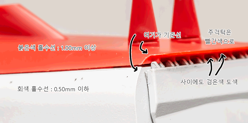 아카데미 독도함의 흘수선은 흰색 선체와 붉은색 선체 양쪽에 걸쳐있습니다. 가능하면 둘 다 조립 후 마스킹테이프로 도색해주시고, 뒤쪽 경첩은 도색이 곤란하므로 조립 전에 미리 검은 칠을 해주시기 바랍니다. 주걱턱은 stern flap 이라고 합니다.